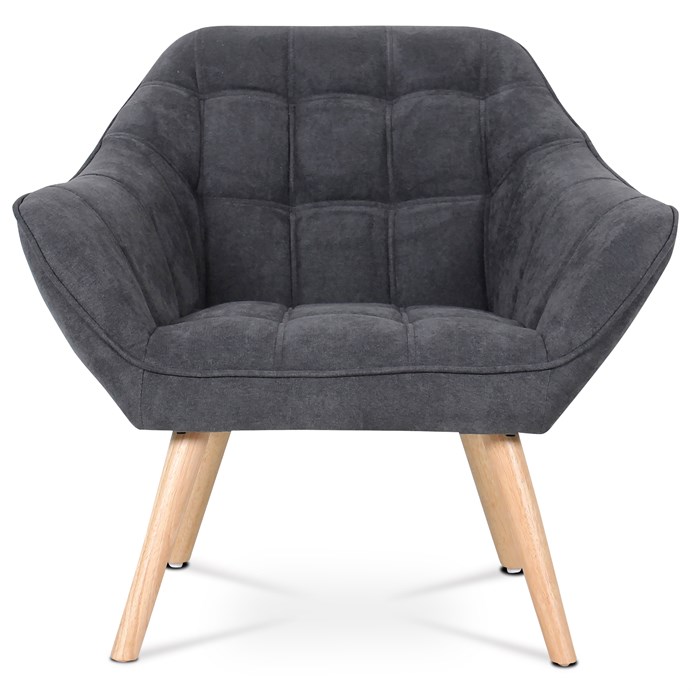 Kreslo s tmavosivým látkovým poťahom ponúka pohodlné sedenie vďaka mäkkému polstrovaniu a dizajnovému prešívaniu, ktoré dodáva celku výrazný charakter. Masívne nohy z kaučukovníka zabezpečujú stabilitu a dlhú životnosť, pričom ich prírodný odtieň kontrastuje s tmavým odtieňom čalúnenia. Široké operadlo a podrúčky sú ergonomicky tvarované pre maximálny komfort počas oddychu. Kreslo je vhodné do moderných aj klasických interiérov, kde vynikne ako štýlový a zároveň praktický doplnok. Jeho pevné prevedenie a kvalitné materiály zaručujú spoľahlivosť pri každodennom používaní.