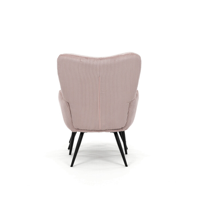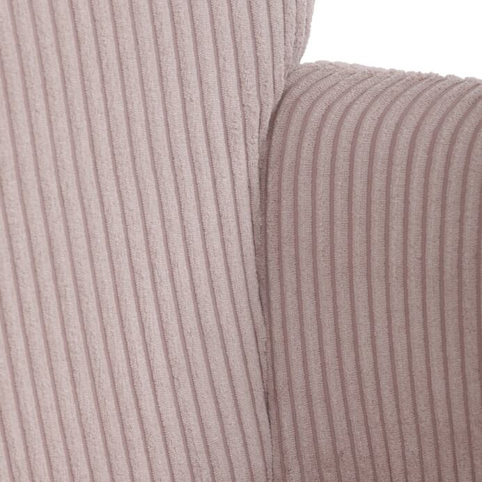 Relaxačné kreslo s podnožkou v ružovom manšestru ponúka pohodlné sedenie s dostatočnou oporou vďaka ergonomicky tvarovanému operadlu a integrovaným podrúčkam. Čalúnenie z manšestrovej látky prináša príjemnú textúru a vizuálny efekt zvýrazňujúci jemné rebrovanie materiálu. Stabilné nohy z čierneho kovu zabezpečujú pevnosť a dlhú životnosť, pričom ich úzky tvar dodáva kreslu ľahkosť a moderný vzhľad. Súčasťou je praktický taburet so zhodným dizajnom a materiálom, ktorý umožňuje pohodlné oprenie nôh a dopĺňa relaxačný zážitok. Kreslo nie je otočné ani rozkladacie, jeho rozmery a pevná konštrukcia sú navrhnuté pre stabilitu a komfort.
