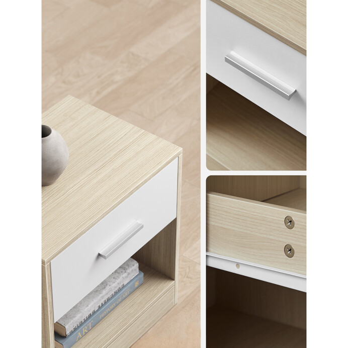 Sada dvoch nočných stolíkov v prírodnej béžovej farbe s bielymi čelami zásuviek ponúka praktické riešenie na usporiadanie priestoru vedľa postele. Sú vyrobené z MDF s matnou povrchovou úpravou v dekore bieleného dubu, ktorá zabezpečuje jednoduchú údržbu a odolnosť voči bežnému opotrebovaniu. Každý stolík má jednu zásuvku s jednoduchou úchytkou a otvorený úložný priestor pod ňou, vhodný na uloženie kníh alebo drobných predmetov. Kompaktné rozmery 39 × 27,6 × 41 cm umožňujú ľahké umiestnenie aj do menších priestorov. Stabilné prevedenie MDF materiálu zaručuje dlhú životnosť a pevnosť stolíka.