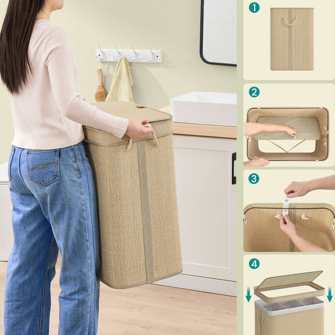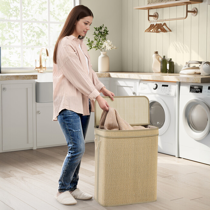 Kôš na bielizeň s rozmermi 49x33x61 cm je vyrobený z prírodného bambusu, ktorý zabezpečuje pevné a stabilné prevedenie. Nosné vzpery z kovu dodávajú košu potrebnú tuhosť a umožňujú jednoduché udržiavanie tvaru aj pri plnom naplnení. Praktické madlo uľahčuje manipuláciu a prenášanie koša. Vnútorná časť je vybavená textilnou vložkou, ktorá uľahčuje ukladanie bielizne a zároveň chráni bambusovú štruktúru. Vďaka prírodnému odtieňu sa kôš hodí do rôznych typov interiérov, kde prináša funkčný a zároveň estetický prvok.