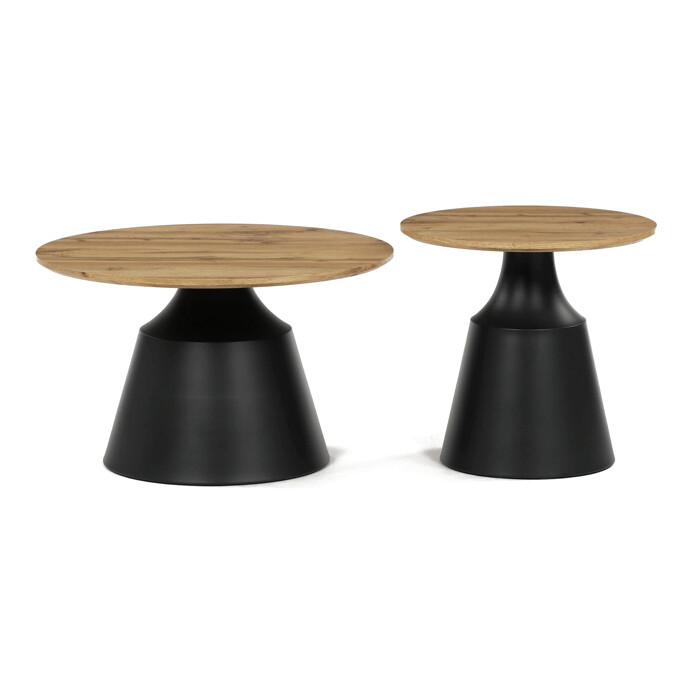 Sada dvoch konferenčných stolov kombinuje dosky z MDF s dekoratívnym povrchom v odtieni dub artisan a stabilné kovové podnože v čiernej farbe. Dosky majú matnú úpravu, ktorá uľahčuje údržbu a zabezpečuje dlhodobú odolnosť proti bežnému opotrebovaniu. Väčší stôl má priemer 70 cm a výšku 42,5 cm, menší potom priemer 50 cm a výšku 47,5 cm, čo umožňuje variabilné usporiadanie v priestore. Kovová podnož je navrhnutá pre pevnosť a stabilitu, čím zabezpečuje bezpečné používanie. Moderný dizajn s kontrastom prírodného dekoru a čiernej farby sa hodí do rôznych interiérov.