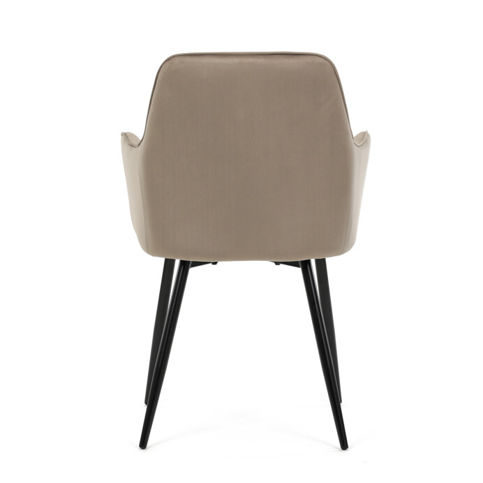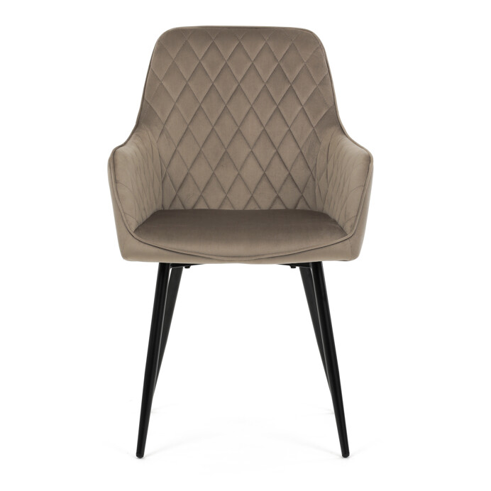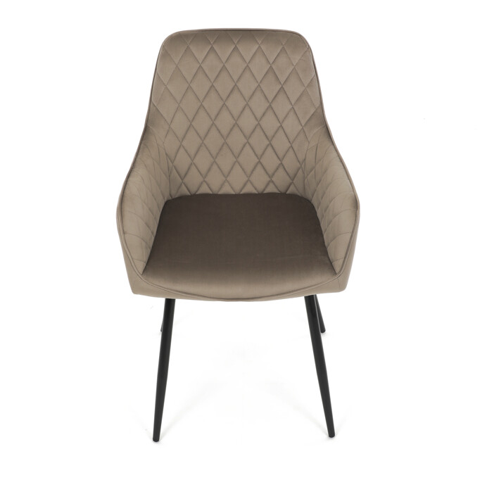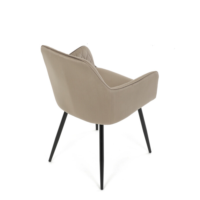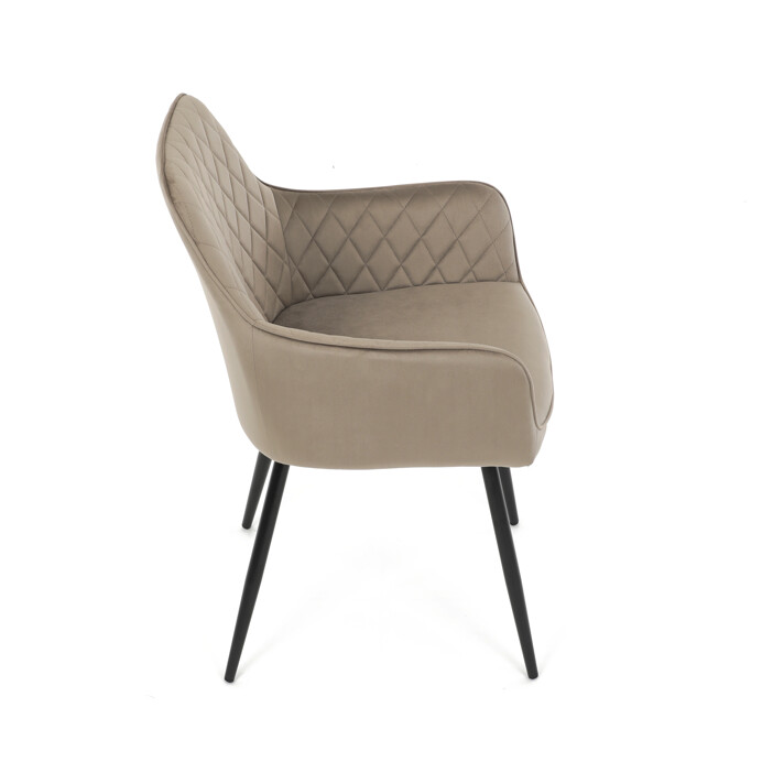 Jedálenská stolička s označením DCH-215 CAP4 ponúka komfortné sedenie vďaka čalúneniu z jemnej zamatovej látky v cappuccino odtieni, ktorá je doplnená dizajnovým prešitím v kosoštvorcovom vzore. Pevné čierne kovové nohy zabezpečujú stabilitu a dlhú životnosť, zatiaľ čo integrované podrúčky prispievajú k pohodliu pri sedení. Sedák aj operadlo sú ergonomicky tvarované pre podporu správneho držania tela počas jedla alebo oddychu. Vďaka kombinácii kvalitných materiálov a precízneho spracovania je stolička vhodná do moderných aj klasických interiérov. Nosnosť a presné rozmery nie sú uvedené, avšak konštrukcia zodpovedá štandardom pre bežné domáce použitie.