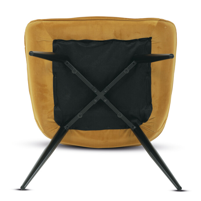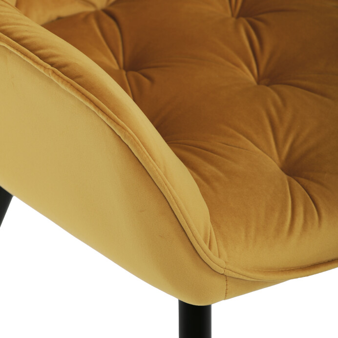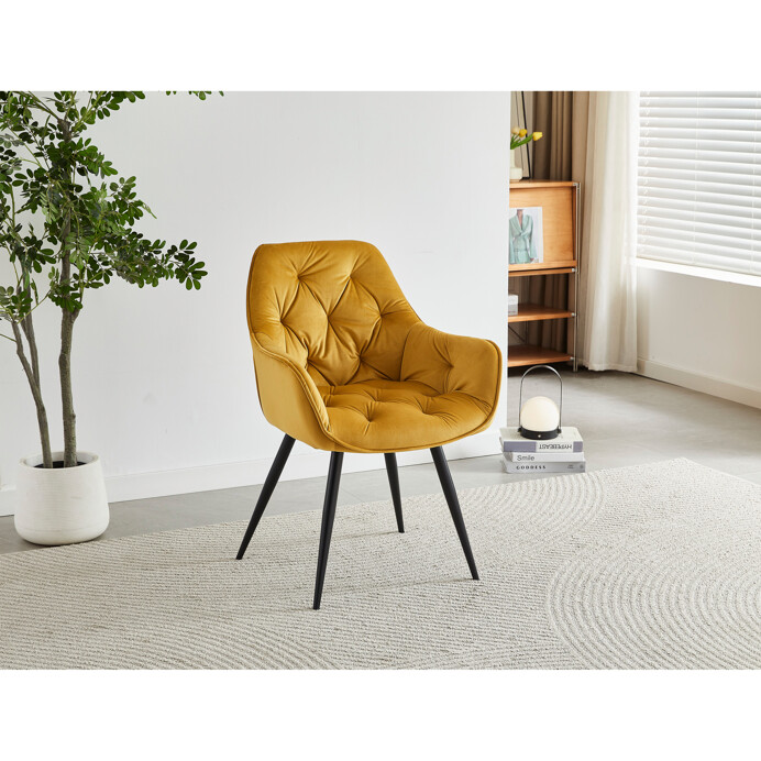 Jedálenská stolička s čalúnením v žltej zamatovej látke ponúka pohodlné sedenie vďaka mäkkému polstrovaniu a ergonomicky tvarovaným podrúčkam. Dizajnové prešívanie na operadle a sedáku dodáva stoličke štýlový vzhľad a zároveň zvýrazňuje jej elegantný profil. Pevná kovová štvornohá podnož s matným čiernym lakom zabezpečuje stabilitu a dlhú životnosť. Stolička je určená na použitie v jedálňach aj moderných interiéroch, kde vynikne jej výrazná farba aj kvalitné spracovanie. Nenáročná údržba látky a robustná konštrukcia podporujú každodenný komfort a funkčnosť.