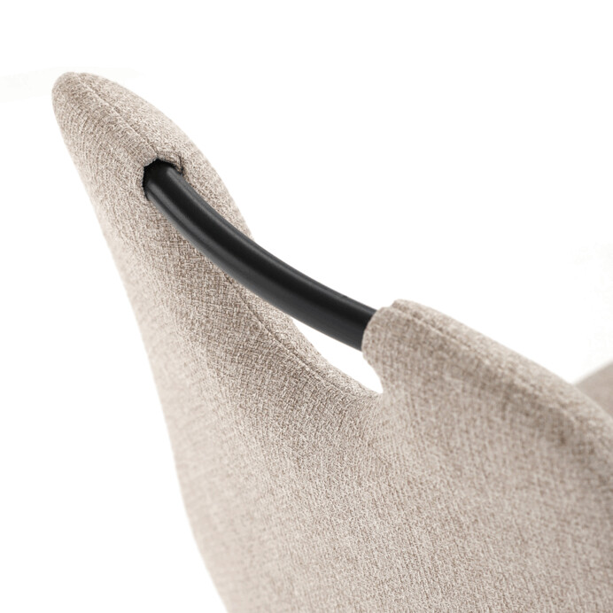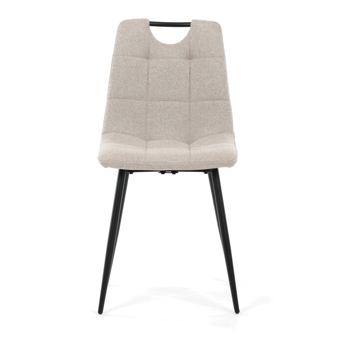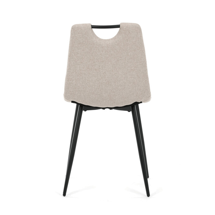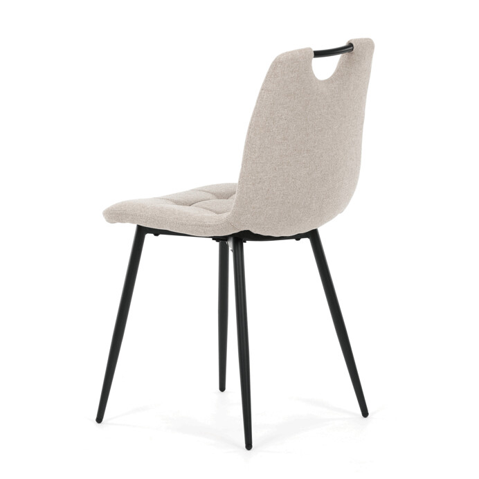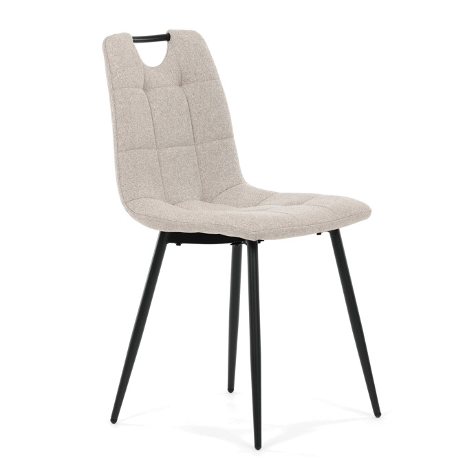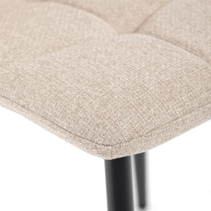 Jedálenská stolička s označením DCL-V2017 CRM2 ponúka kombináciu pohodlia a praktickosti v modernom dizajne. Sedák a operadlo sú potiahnuté béžovou látkou, ktorá je ľahko udržovateľná a doplnená dizajnovým prešitím pre zvýraznenie estetického dojmu. Pevné kovové nohy s matnou čiernou povrchovou úpravou zaisťujú stabilitu a dlhú životnosť. Praktickým prvkom je madlo v hornej časti operadla, ktoré uľahčuje manipuláciu a prenášanie stoličky. Stolička nemá podrúčky ani otočný mechanizmus, čo ju robí kompaktnou a vhodnou do rôznych interiérov.