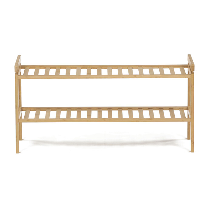 Botník s dvoma policami je vyrobený z masívneho bambusu v prírodnom odtieni, ktorý zabezpečuje pevnosť a dlhú životnosť. Otvorená polica s vodorovnými latkami umožňuje efektívne vetranie a rýchle schnutie obuvi. Jednoduchý a funkčný dizajn botníka sa hodí do rôznych interiérov, kde ponúka praktické riešenie na uskladnenie topánok. Stabilný rám a rovné nohy zaručujú bezpečné a pevné postavenie. Rozmery botníka umožňujú uloženie viacerých párov obuvi bez zbytočnej náročnosti na priestor.