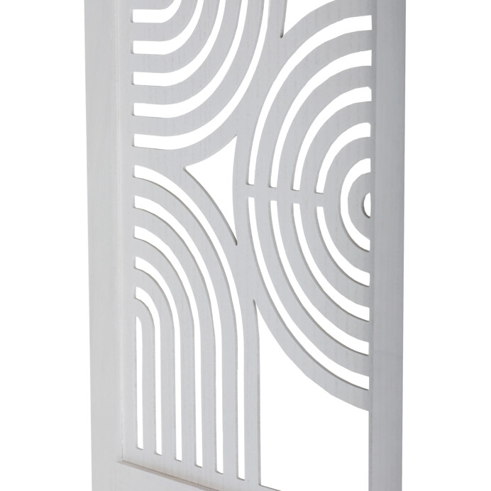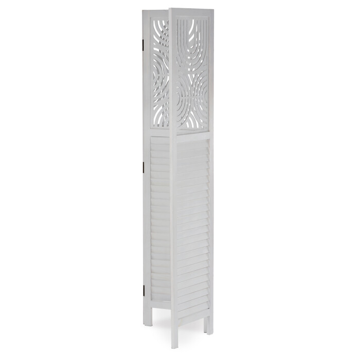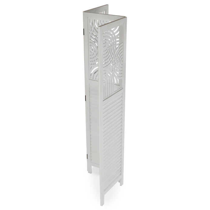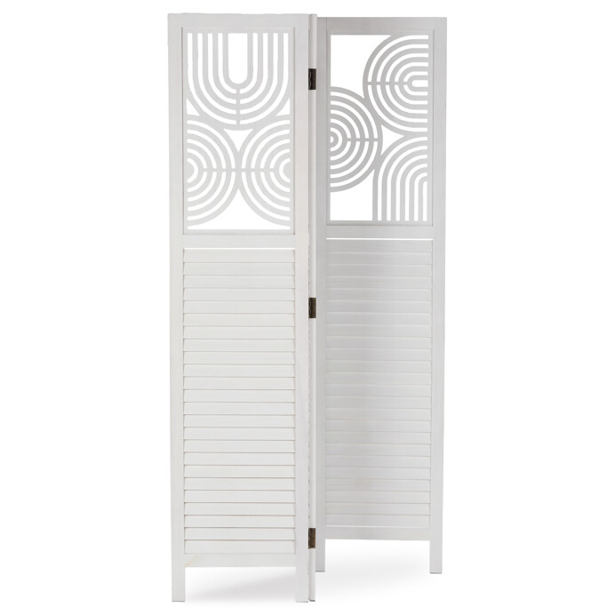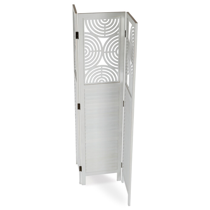 Trojdielny paraván vyrobený z masívneho smrekového dreva v bielej farbe ponúka praktické riešenie na rozdelenie priestoru v interiéri. Každý diel je doplnený dekoratívnymi výrezmi v hornej časti, ktoré prepúšťajú svetlo a zároveň zachovávajú súkromie. Masívny materiál zabezpečuje pevnosť a stabilitu, zatiaľ čo prírodná textúra dreva dodáva výrobku prirodzený vzhľad. Paraván je vhodný na použitie v obývacích izbách, spálňach alebo kanceláriách, kde pomáha vytvoriť útulné a funkčné prostredie. Vďaka skladacej konštrukcii je ľahko premiestniteľný a skladovateľný.