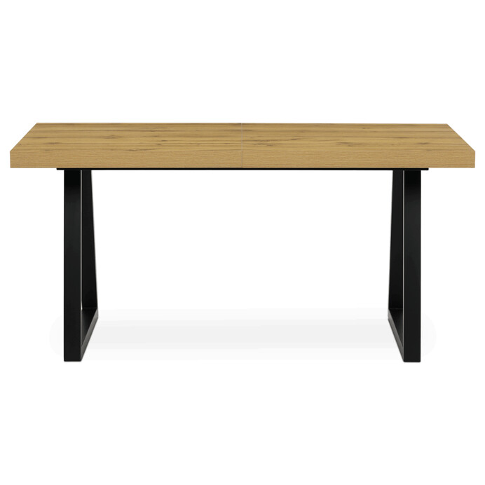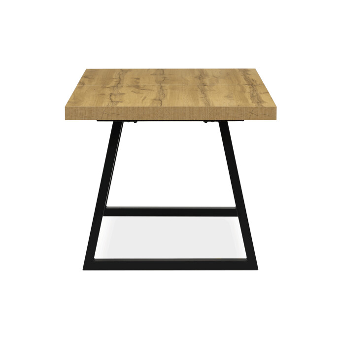 Jedálenský stôl s rozkladacou funkciou ponúka praktické riešenie pre flexibilné usporiadanie jedálenského priestoru. Doska stola je vyrobená z lamina s dubovým dekorom a matnou povrchovou úpravou, ktorá je odolná proti poškriabaniu a ľahko sa udržiava. Hrany dosky sú opatrené ABS lištou, ktorá zvyšuje odolnosť proti poškodeniu a zároveň dodáva stolu precízny vzhľad. Stabilná kovová podnož v čiernej farbe zabezpečuje pevnú oporu a stabilitu počas používania. Rozmery 160x90 cm je možné rozšíriť o 80 cm, čo umožňuje pohodlné usadenie väčšieho počtu osôb. Výška stola 76 cm zodpovedá štandardným ergonomickým parametrom pre jedálenský nábytok.