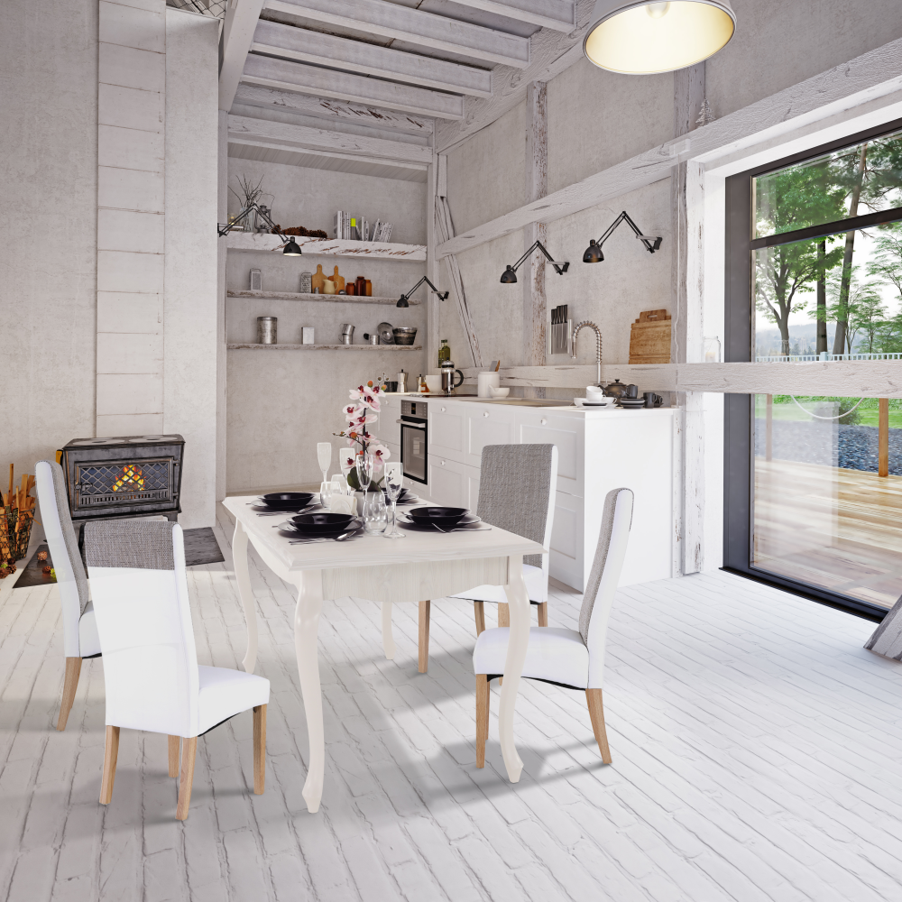 Materiál: DTD laminovaná/ABS hrany Farba: sosna biela Rozmery (ŠxHxV): 146x76x76 cm Hrúbka materiálu: 30 mm 3D efekt Drevené nohy ABS hrany Barokový štýl