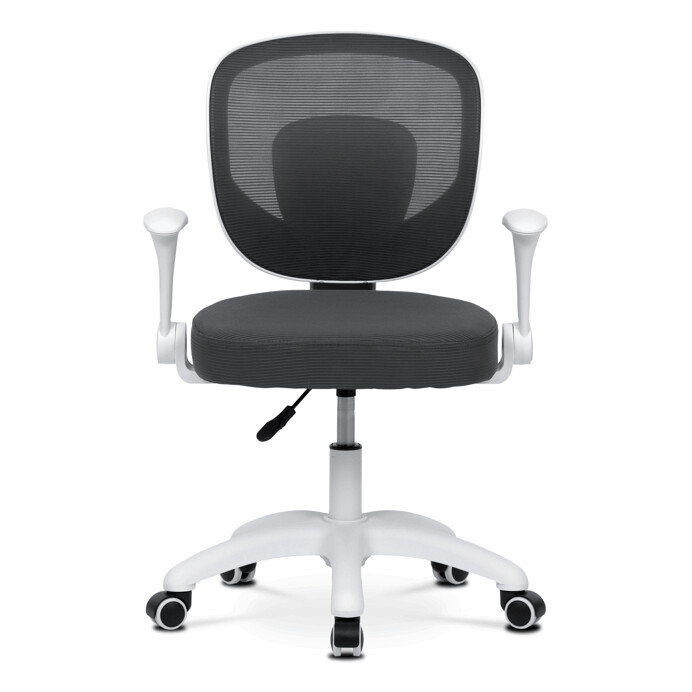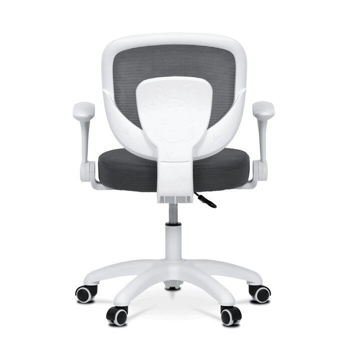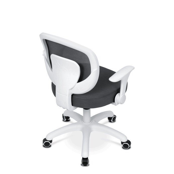 Detská stolička so sivým sieťovinovým poťahom ponúka priedušné a pohodlné sedenie vhodné pre mladších používateľov. Operadlo je z ľahkej a pevnej sieťoviny, ktorá podporuje cirkuláciu vzduchu, zatiaľ čo sedák je čalúnený látkou rovnakej farby pre príjemný komfort. Biele plastové nohy s piatimi ramenami zabezpečujú stabilitu a sú vybavené kolieskami určenými na tvrdé podlahy, čo umožňuje ľahký pohyb bez poškodenia povrchu. Odklápacie podrúčky prispievajú k flexibilite používania a výškovo nastaviteľný mechanizmus umožňuje prispôsobenie výšky sedáka podľa potreby dieťaťa. Stolička je navrhnutá tak, aby kombinovala funkčnosť s jednoduchým dizajnom vhodným do detských izieb.