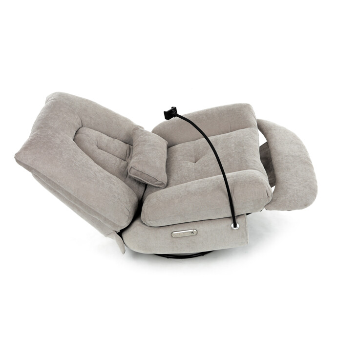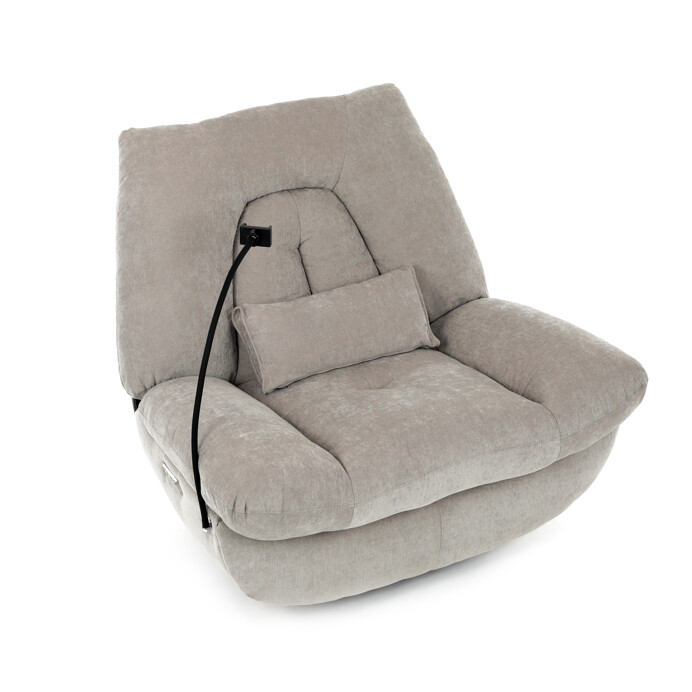 TV kreslo s elektrikom pohovaním v béžovom lanýžovom poťahu učena komfortné sedenie s možnosťou poznávania s pozného szého motora. Kovová podnož umožňuje rotáciu až o 240° a hojdačný pohyb o 30°, čo prispieva k relaxácii a pohodliu. Vstavané ovládanie je doplnené o hlasové ovládanie pre jednoduché nastavenie, zatiaľ čo integrovaný Bluetooth reproduktor zaisťuje kvalitný zvukový doprovod. Medzi praktické funkcie patrí držiak na telefón, porty USB-A a USB-C na nabíjanie zariadení a úložný box na drobné predmety. Pevná konštrukcia s nosnosťou 160 kg a ergonomicky tvarované sedadlo s dlhotrvajúcim komfortom a stabilitou.