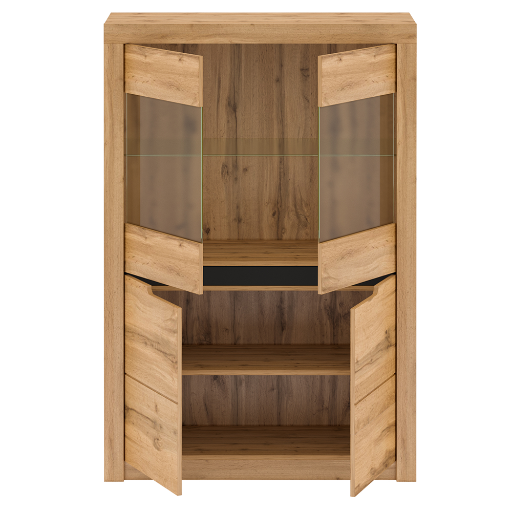 Materiál: DTD laminovaná/ MDF fóliovaná Farba: dub wotan Rozmery (ŠxHxV): 102,8x39,7x150,7 cm Hrúbka materiálu korpus: 16 mm Hrúbka materiálu dvierka: 19 mm Štvordverová Štyri skrinky Presklenná S policami Dodávané v demonte.