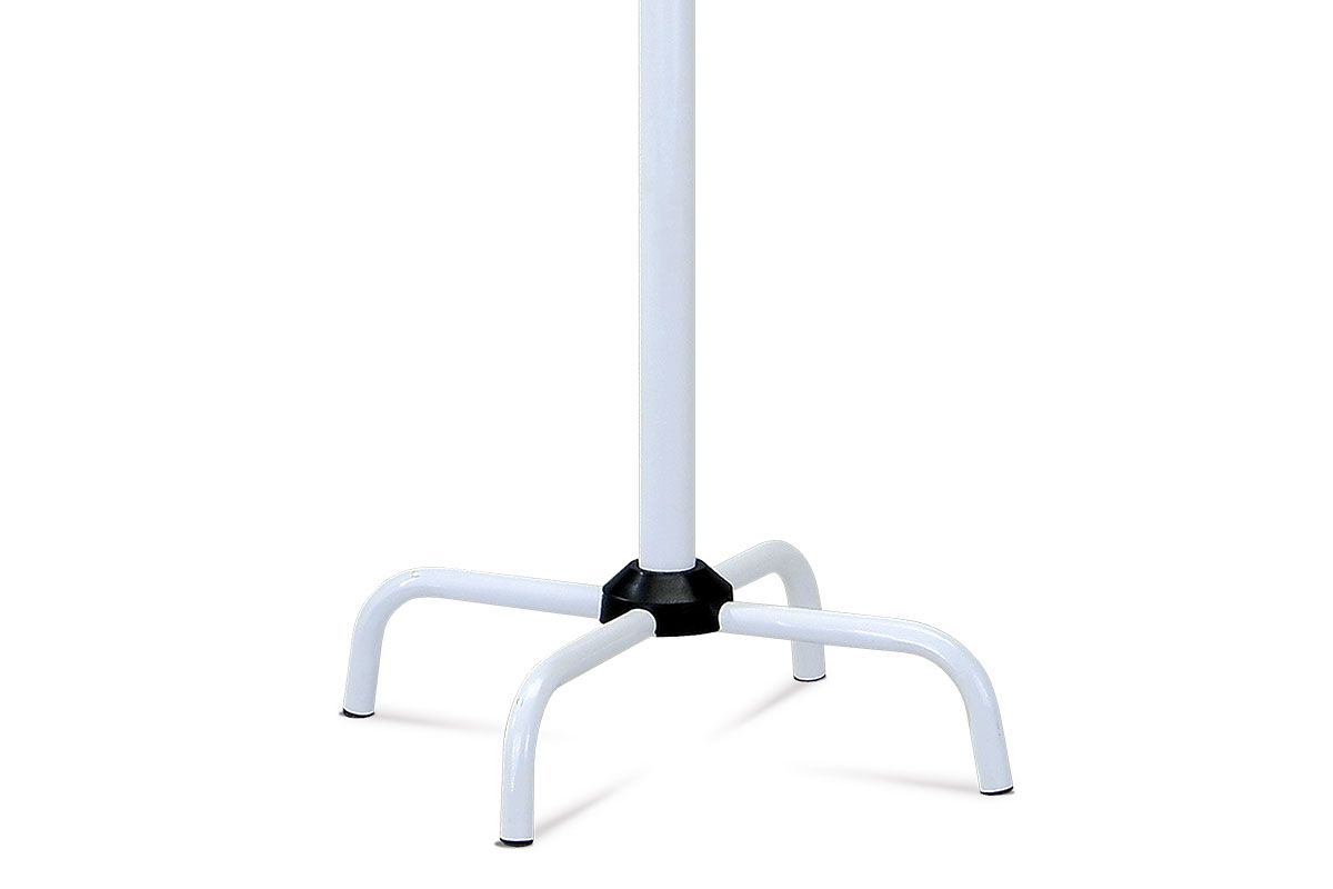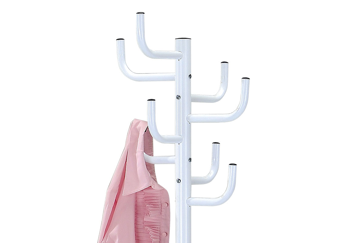 Moderný a praktický vešiak v bielom vysokom lesku. Vešiak je kovový.