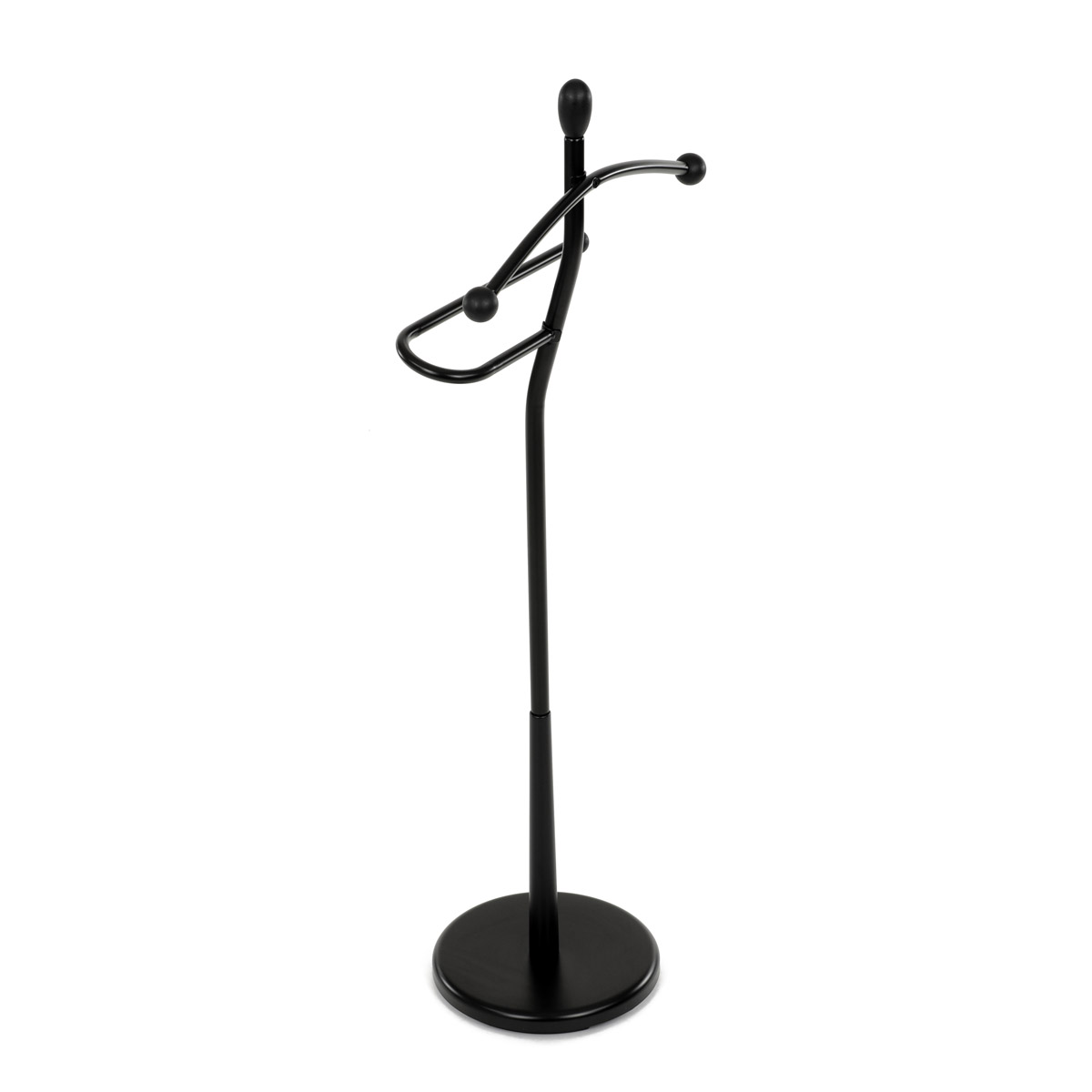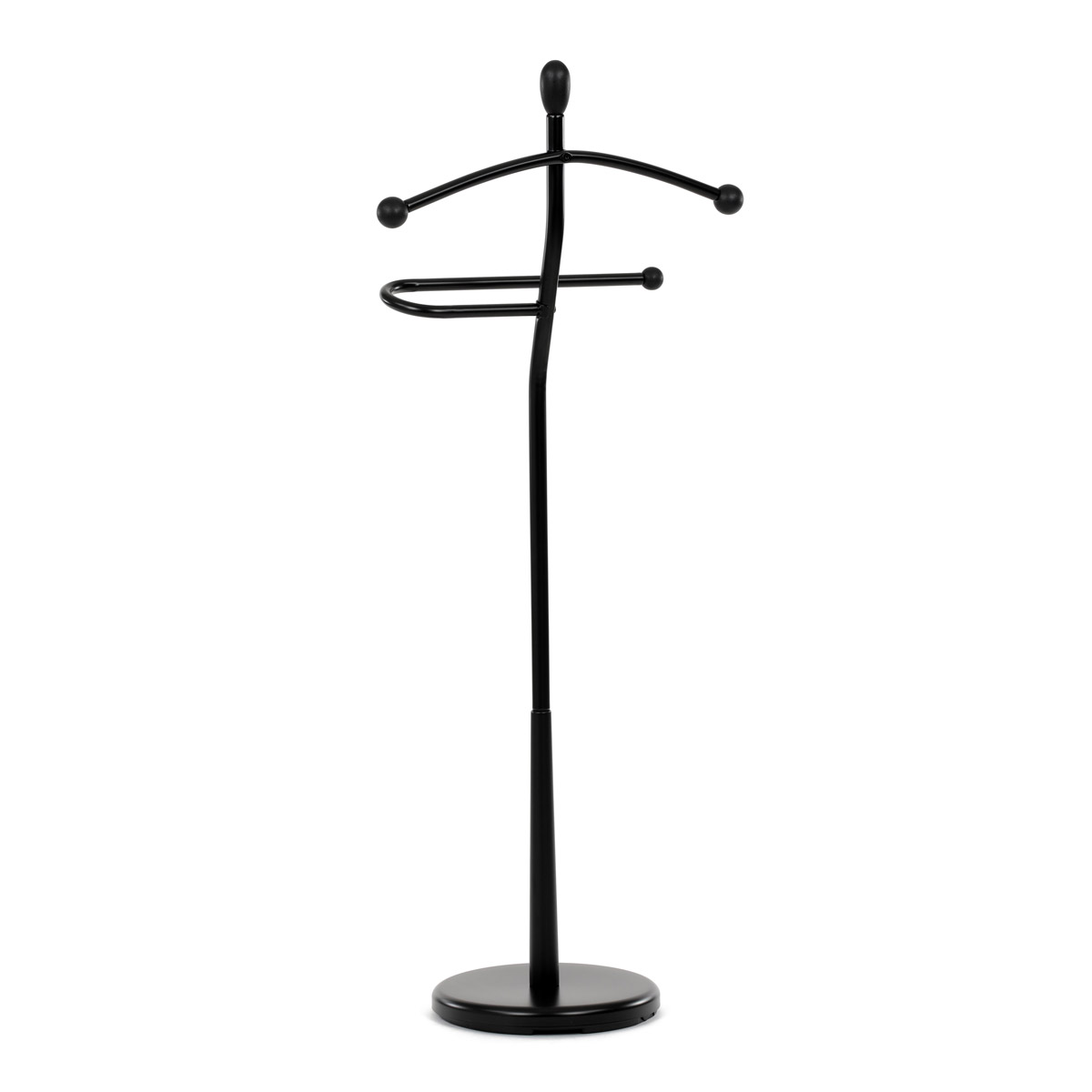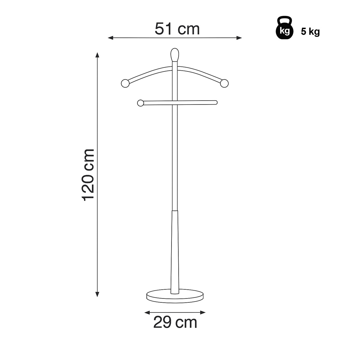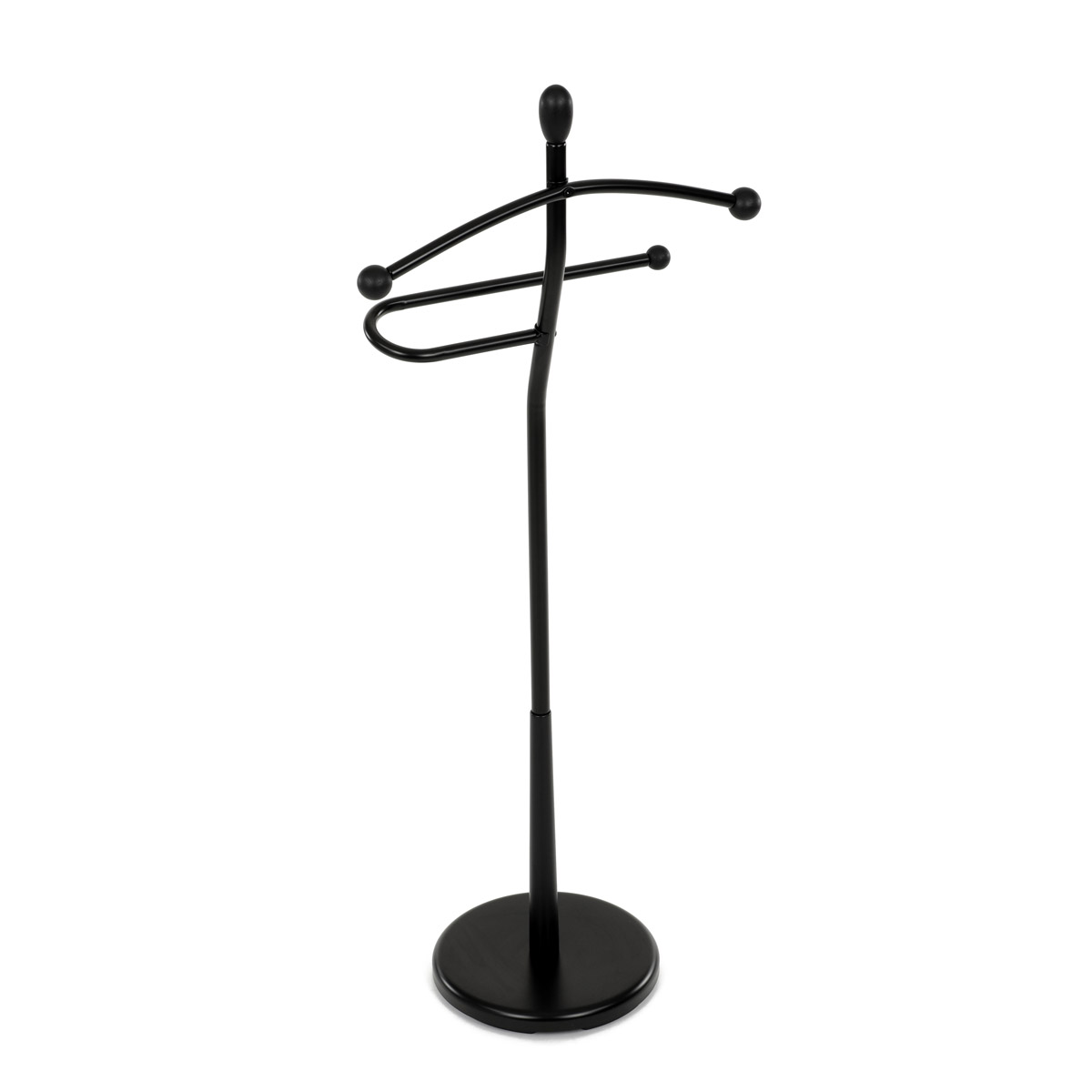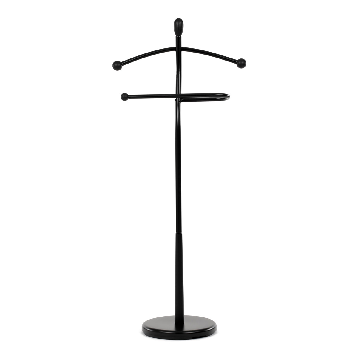 Praktický minimalistický nemý sluha v sebe kombinuje prvky z masívneho kaučukovníkového dreva s kovovými nosnými dielmi v čiernej povrchovej úprave. Tento model je v celočiernom prevedení. Výška 120 cm Vám umožní zavesenie oblečenia aj doplnkov úplne bez pokrčenia. Nosnosť stojana je až 5 kg rovnomerne rozprestretej záťaže, hmotnosť 5 kg. Konštrukcia je zakončená kovovou chrómovanou podestou so záťažou v čiernom plastovom puzdre. Stojan je jednoducho prenositeľný a je možné ho umiestniť podľa momentálnej potreby aj nálady. Štýlom a jednoduchosťou sa hodí do akéhokoľvek interiéru. Využitie je nepreberné, záleží len na Vás.