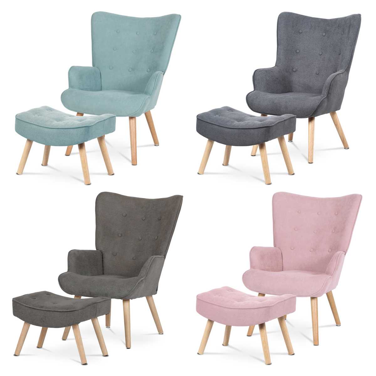 Kreslo minimalistických línií v škandinávskom štýle. Vyniká vysokým prehnutým operadlom, úzkymi a krátkymi podrúčkami a dekoratívnymi jemnými čalounickými vťahmi zakončenými gombíkmi na čelnej strane operadla. To všetko vytvára charakteristické severské retro línie tohto kresla. Nielen dizajn, ale hlavne pohodlie ktoré Vás obklopí pri sadnutí, bude príjemné spestrenie pri chvíľach odpočinku a relaxácie. A na jeho zvýšenie výborne poslúži aj štvornohá a polstrovaná podnožka na vyloženie nôh, ktorú ale môžete použiť aj ako príležitostný taburet. Poťah je z trendy svetlo modrej látky, kostra z masívneho dreva a výplň z kvalitnej PU peny. V mieste sedadla sú na skvalitnenie sedenia elastické popruhy. Dlhé kónické drevené nohy sú z masívneho kaučukovníka v prírodnom odtieni a lakované transparentným lakom. Aby bolo eliminované poškodenie podlahovej krytiny, sú opatrené plastovými klzákmi. U zadných nôh rektifikovateľnými. Nosnosť kresla je 120 kg.