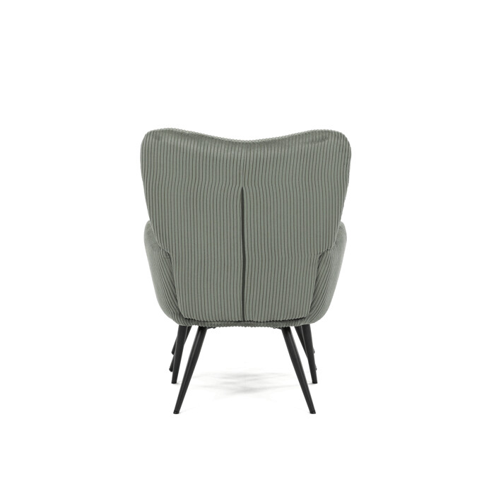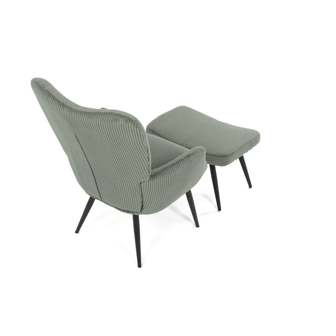 Relaxačné kreslo s podnožkou v zelenej manšestri ponúka pohodlné sedenie s mäkkým, príjemným poťahom, ktorý zvýrazňuje štruktúru manšestru. Pevné čierne kovové nohy zabezpečujú stabilitu a dlhú životnosť, zatiaľ čo integrované podrúčky prispievajú k pohodliu pri oddychu. Kreslo nie je otočné ani rozkladacie, no vďaka pridanému taburetu umožňuje pohodlné oprenie nôh a relaxáciu. Dizajn kombinuje klasický tvar s moderným materiálom, čo ho robí vhodným doplnkom do obývacích izieb aj relaxačných zón. Celková konštrukcia je navrhnutá tak, aby poskytovala komfortné sedenie s dôrazom na pevnosť a stabilitu.