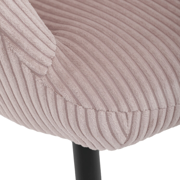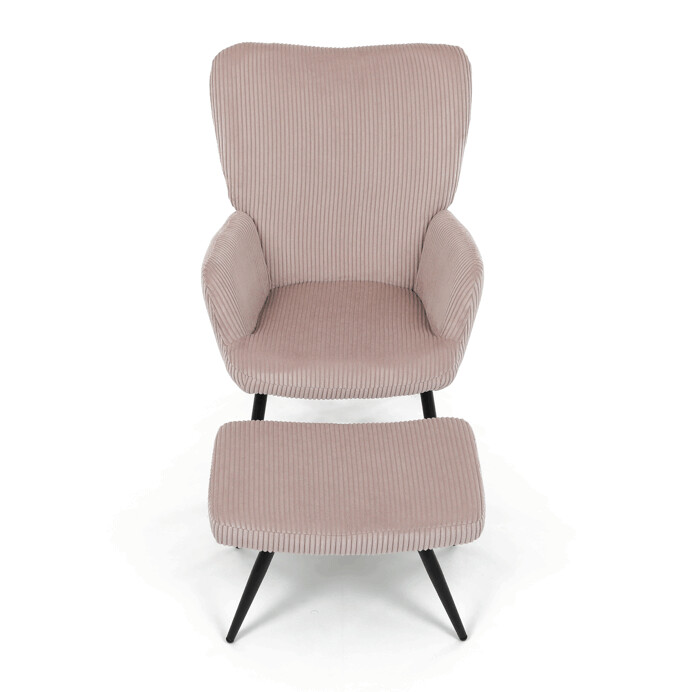 Relaxačné kreslo s podnožkou v ružovom manšestru ponúka pohodlné sedenie s dostatočnou oporou vďaka ergonomicky tvarovanému operadlu a integrovaným podrúčkam. Čalúnenie z manšestrovej látky prináša príjemnú textúru a vizuálny efekt zvýrazňujúci jemné rebrovanie materiálu. Stabilné nohy z čierneho kovu zabezpečujú pevnosť a dlhú životnosť, pričom ich úzky tvar dodáva kreslu ľahkosť a moderný vzhľad. Súčasťou je praktický taburet so zhodným dizajnom a materiálom, ktorý umožňuje pohodlné oprenie nôh a dopĺňa relaxačný zážitok. Kreslo nie je otočné ani rozkladacie, jeho rozmery a pevná konštrukcia sú navrhnuté pre stabilitu a komfort.