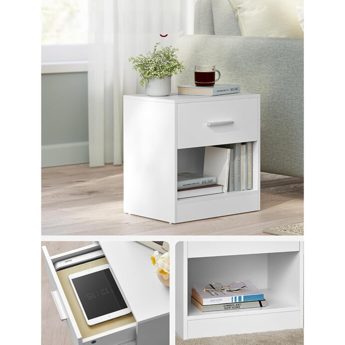 Sada dvoch nočných stolíkov v bielom matnom prevedení je vyrobená z MDF dosiek, ktoré zabezpečujú pevnosť a jednoduchú údržbu. Každý stolík ponúka praktický úložný priestor v podobe zásuvky s kovovou úchytkou a otvorenej police pod ňou, čo umožňuje pohodlné usporiadanie drobností aj kníh. Kompaktné rozmery 39 × 28 × 41 cm umožňujú jednoduché umiestnenie vedľa postele alebo do menších priestorov. Minimalistický dizajn s čistými líniami sa hodí do rôznych štýlov interiérov a vďaka kvalitnému spracovaniu je sada navrhnutá pre dlhú životnosť.