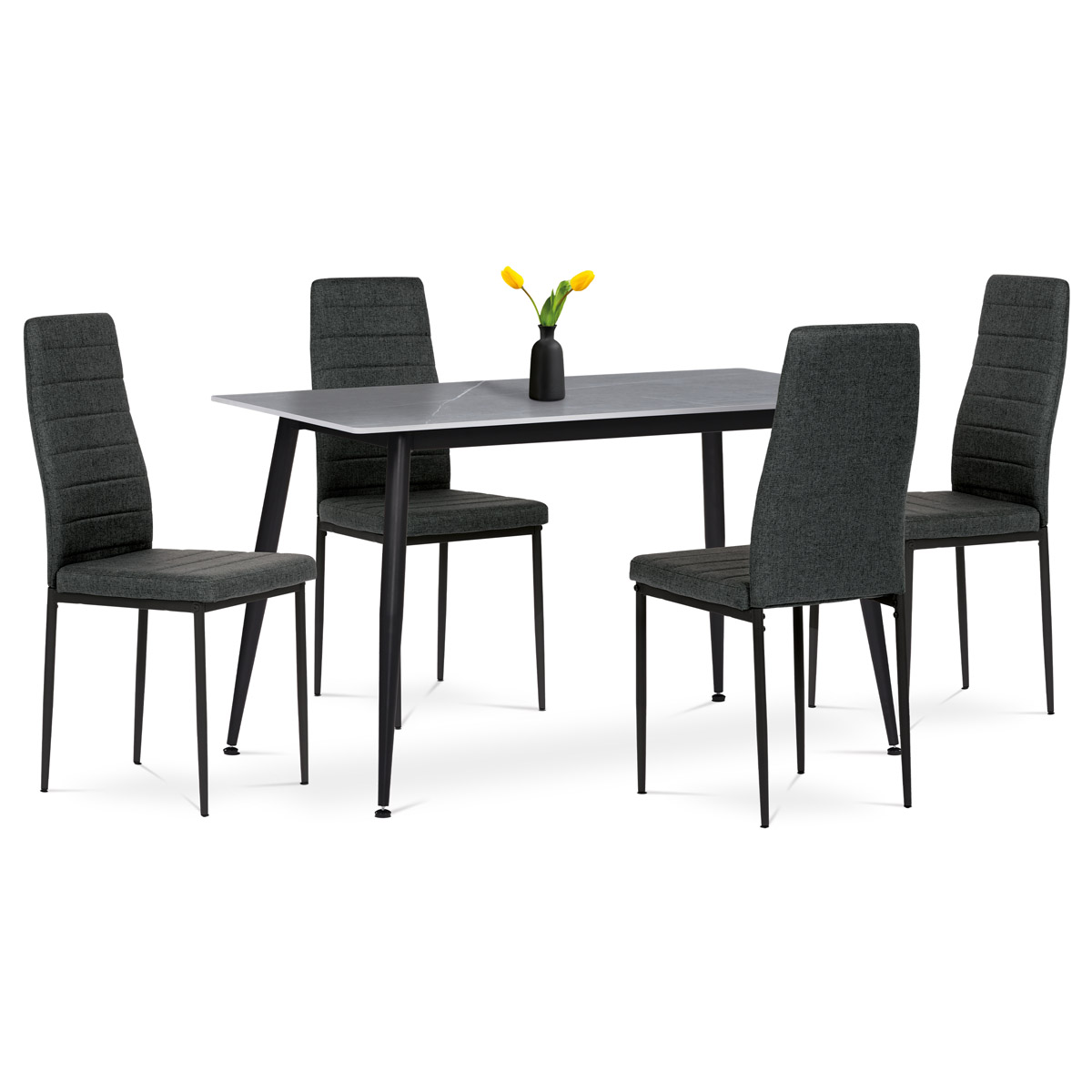 Moderný jedálenský set Autronic v industriálnom štýle je skvelou voľbou pre vašu jedáleň. Obdĺžnikový stôl s doskou zo spekanej keramiky v šedom mramorovom dekore pôsobí elegantne a je odolný voči poškriabaniu. Stabilitu zaisťujú čierne kovové nohy s jemne kónickým tvarom. Pohodlné stoličky majú čalúnenie z hladkej čiernej látky a ergonomicky tvarovanú opierku pre maximálny komfort. Čierne kovové nohy ladia so stolom a dodávajú celku jednotný vzhľad. Ideálna voľba pre štýlové a funkčné stolovanie.