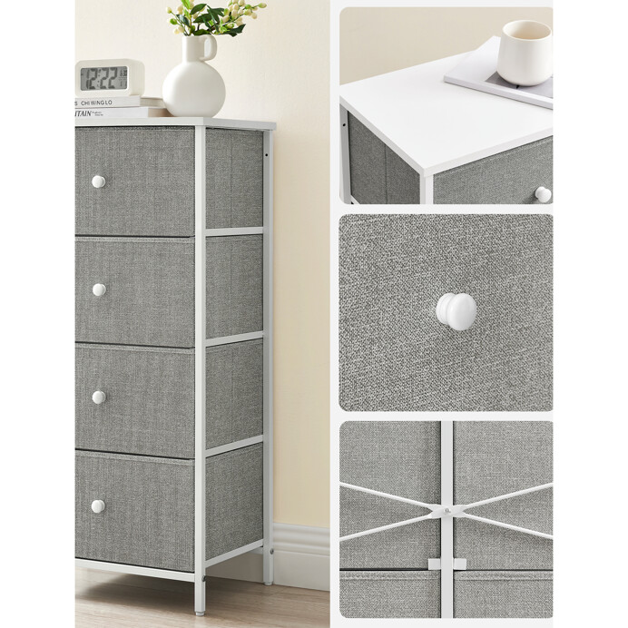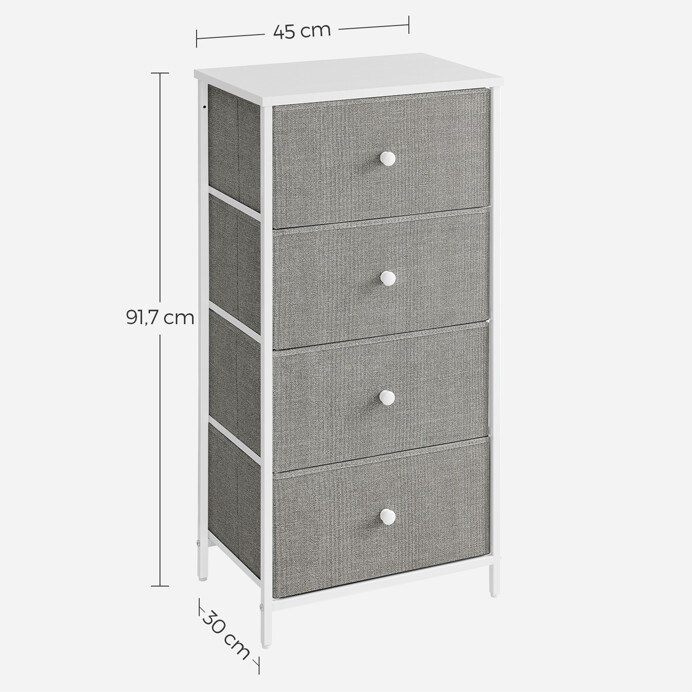 Komoda s rozmermi 45x30x92 cm kombinuje pevnú MDF dosku s matnou povrchovou úpravou v bielej farbe a stabilnú kovovú konštrukciu nôh. Štyri priestranné zásuvky z netkanej textílie v sivom odtieni poskytujú praktický úložný priestor pre rôzne drobnosti a zároveň uľahčujú organizáciu. Jednoduchý dizajn s decentnými bielymi úchytkami ladí s moderným aj škandinávskym štýlom interiéru. Komoda je navrhnutá tak, aby bola ľahká a zároveň dostatočne pevná pre každodenné použitie. Vďaka kompaktným rozmerom sa hodí do menších priestorov, kde je potrebné efektívne využiť miesto.