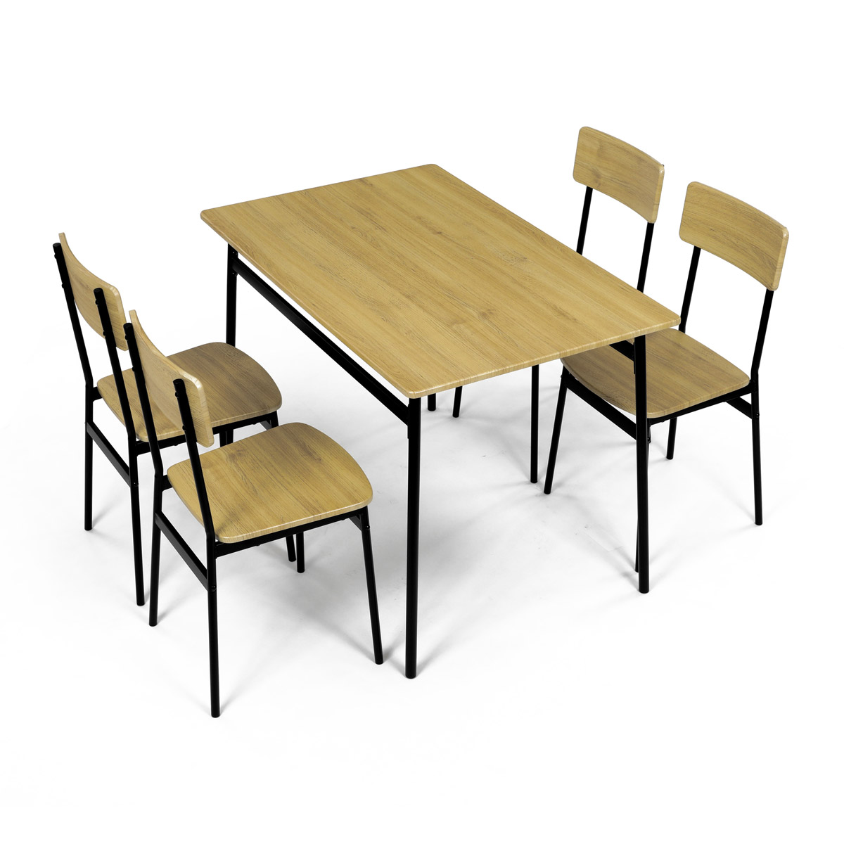 Jedálenský set od značky Autronic v industriálnom štýle je ideálnou voľbou pre moderné interiéry. Zostava obsahuje stôl a štyri stoličky s čiernymi kovovými nohami, ktoré vytvárajú zaujímavý kontrast s doskami v dekore divokého duba. Stôl aj stoličky sú vyrobené z kvalitného MDF, ktoré zaručuje vysokú odolnosť a stabilitu. Tento set je navrhnutý na pohodlné stolovanie štyroch osôb a perfektne sa hodí do jedálne. Vďaka svojmu minimalistickému dizajnu a prírodným tónom ľahko zapadne do každého moderného domova.