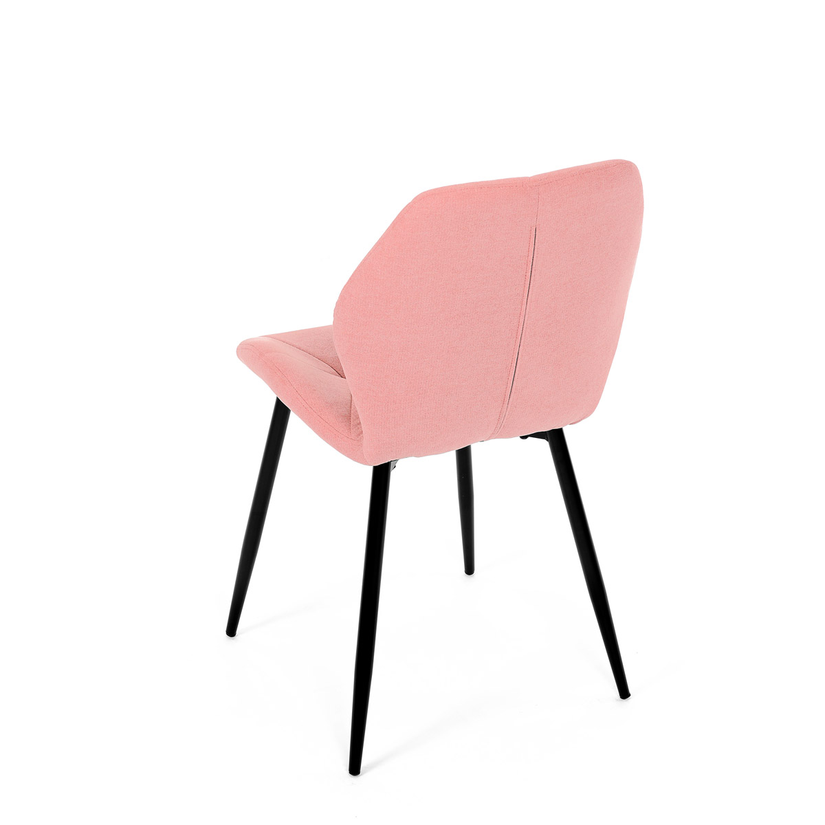 Táto moderná jedálenská stolička v jemnej ružovej farbe je skvelým doplnkom každého interiéru. Vďaka svojmu elegantnému dizajnu a pohodlnému čalúneniu je ideálnou voľbou pre Vašu jedáleň, kuchyňu alebo pracovný priestor. Stolička je čalúnená kvalitnou látkou, ktorá je mäkká na dotyk a zároveň odolná proti opotrebovaniu. Ergonomicky tvarované sedadlo a operadlo s dekoratívnym prešívaním poskytujú vysoký komfort aj pri dlhšom sedení. Stolička stojí na pevných kovových nohách v čiernom prevedení, ktoré zaisťujú stabilitu a dlhú životnosť. Nohy sú elegantne skosené, čo dodáva stoličke moderný vzhľad a zaisťuje pevnú stabilitu.