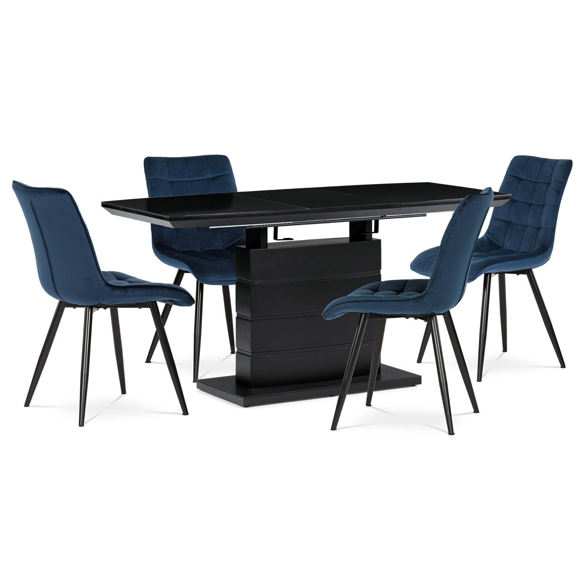 Moderná jedálenská stolička je potiahnutá do hebkého zamatu v modrej farbe. Elegantné štvorcové prešitie vo farbe poťahového materiálu. Podnož je prevedená v nástreku čierneho polomatného laku. Nohy majú kruhový profil.