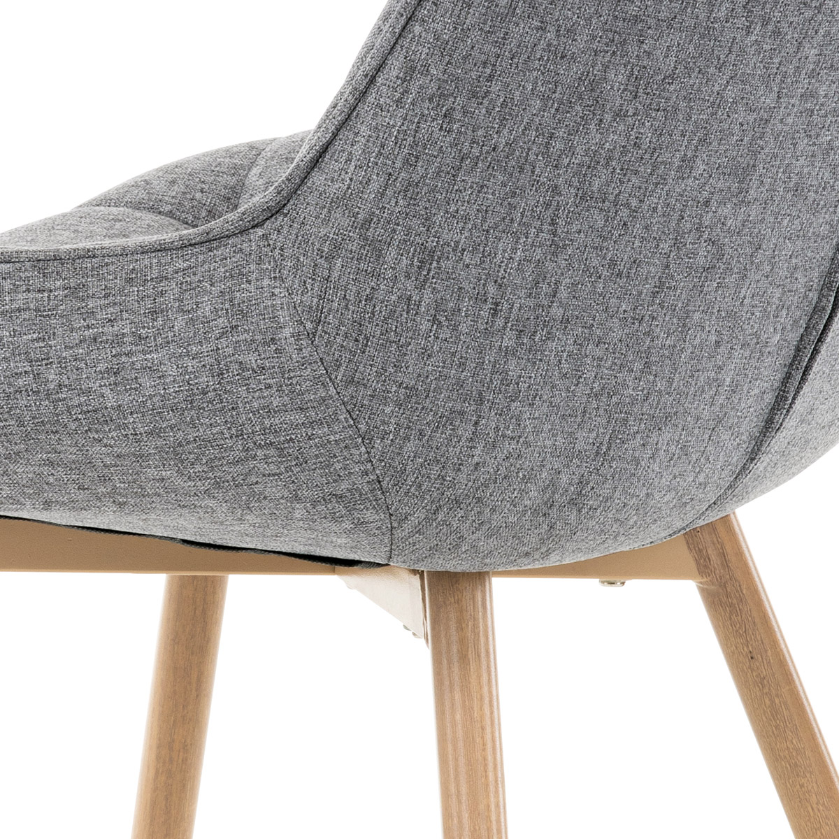 Dizajnová škrupinová jedálenská stolička je čalúnená šedou látkou s výrazným prešitím sedacej časti aj časti určenej na opretie. Sedacia časť je zaoblená a má vyvýšené boky, plynule prechádzajúce do operadla. Polstrovanie je z kvalitnej PU peny. Štvornohá kovová podnož je v 3D dekore dub. Nohy sú kruhového prierezu a kónické, ukončené čiernymi platovými klzákmi. Celá podnož je zvarená a dodávaná ako celok, nehrozí teda občasné doťahovanie skrutiek ako pri podnoži skrutkované. Toto všetko pôsobí nielen ako štýlový dizajnový prvok, ale robí stoličku veľmi pevnú, pohodlnú a praktickú na kratšie aj dlhšie posedenie. Svojím prevedením v Škandinávskom štýle a decentnou farebnosťou sa stolička hodí nielen k jedálenskému stolu, ale aj ako súčasť pracovní či konferenčných miestností.