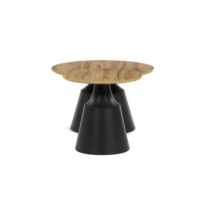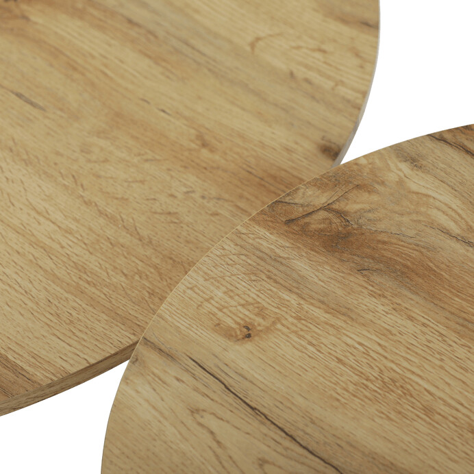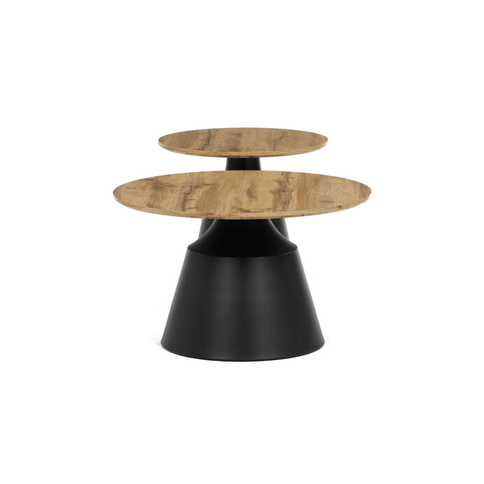 Sada dvoch konferenčných stolov kombinuje dosky z MDF s dekoratívnym povrchom v odtieni dub artisan a stabilné kovové podnože v čiernej farbe. Dosky majú matnú úpravu, ktorá uľahčuje údržbu a zabezpečuje dlhodobú odolnosť proti bežnému opotrebovaniu. Väčší stôl má priemer 70 cm a výšku 42,5 cm, menší potom priemer 50 cm a výšku 47,5 cm, čo umožňuje variabilné usporiadanie v priestore. Kovová podnož je navrhnutá pre pevnosť a stabilitu, čím zabezpečuje bezpečné používanie. Moderný dizajn s kontrastom prírodného dekoru a čiernej farby sa hodí do rôznych interiérov.