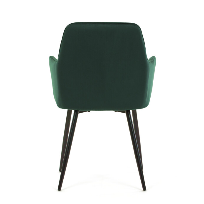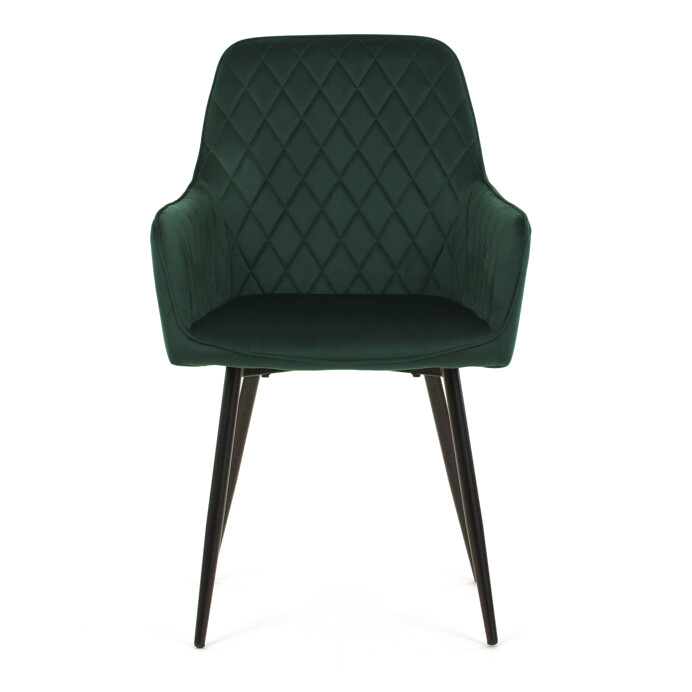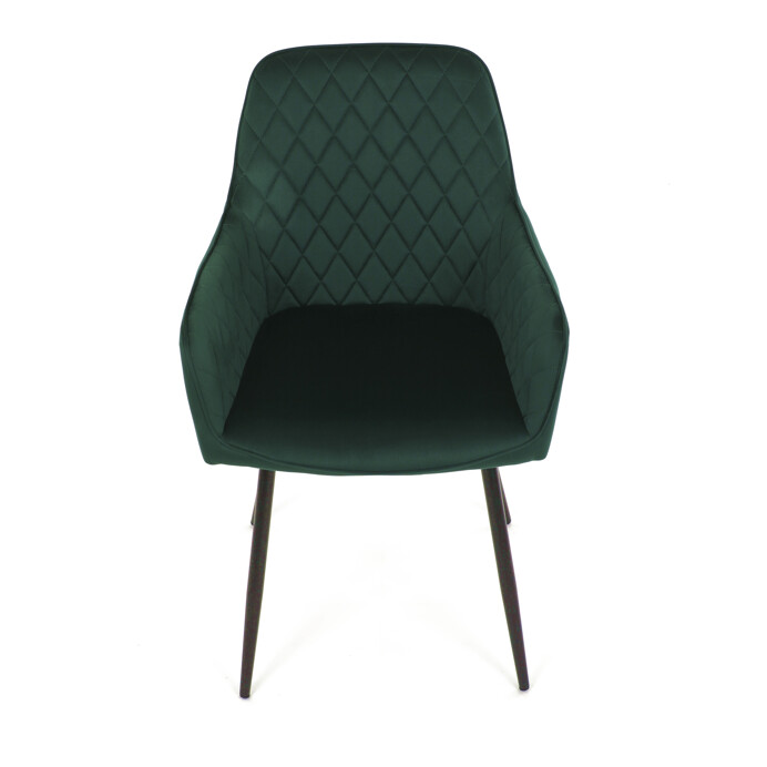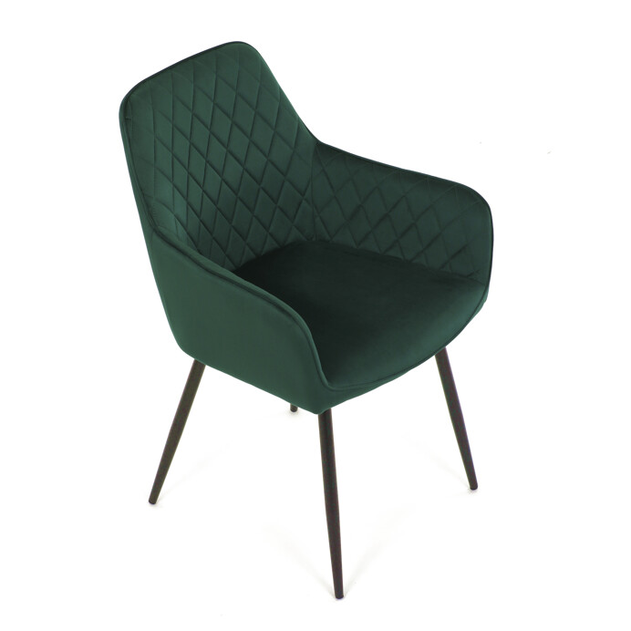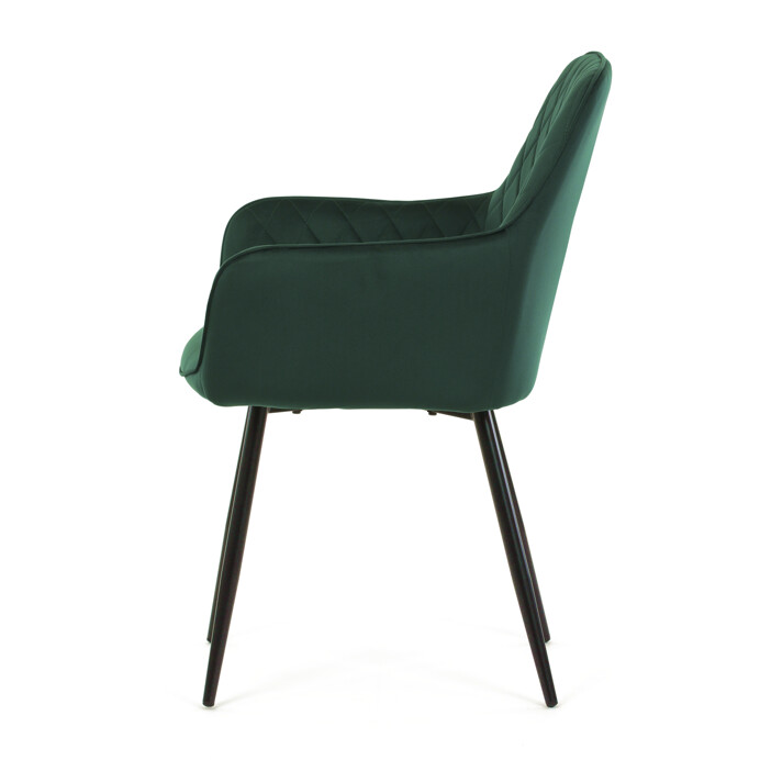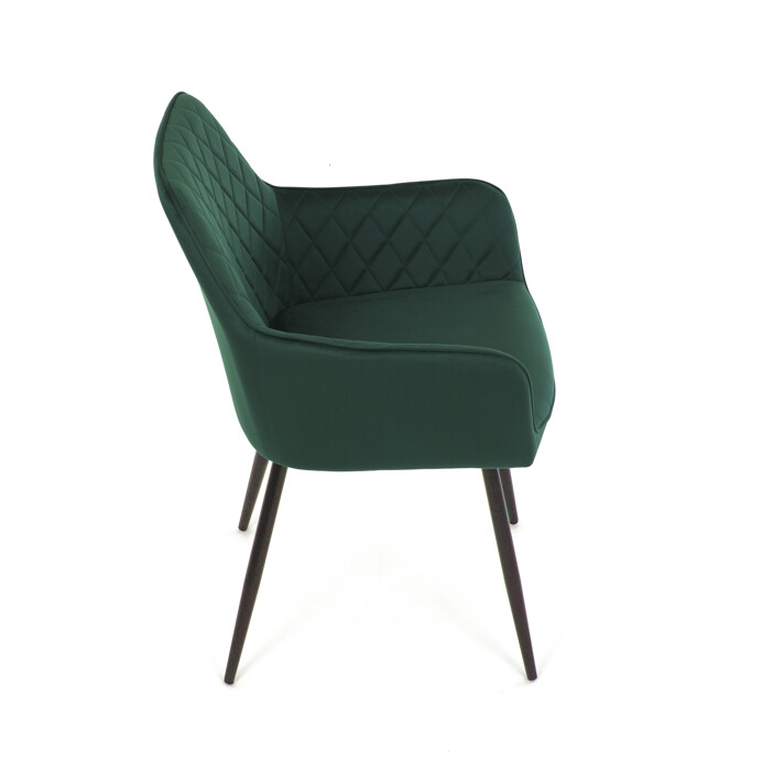 Jedálenská stolička s označením DCH-215 GRN4 ponúka pohodlné sedenie vďaka čalúneniu z kvalitnej zelenej zamatovej látky, ktorá je príjemná na dotyk a ľahko sa udržiava. Operadlo aj sedák sú doplnené dizajnovým prešitím v kosoštvorcovom vzore, ktoré podčiarkuje moderný vzhľad stoličky. Pevné čierne kovové nohy zabezpečujú stabilitu a dlhú životnosť, zatiaľ čo integrované podrúčky prispievajú k vyššiemu komfortu pri sedení. Stolička je určená na použitie v jedálňach, kuchyniach či kaviarňach, kde kombinuje estetiku s funkčnosťou.