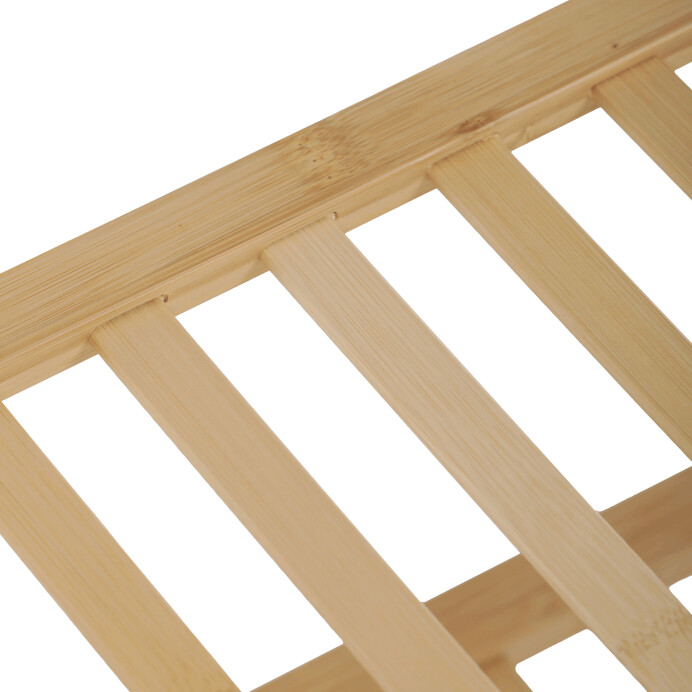 Botník s dvoma policami je vyrobený z masívneho bambusu v prírodnom odtieni, ktorý zabezpečuje pevnosť a dlhú životnosť. Otvorená polica s vodorovnými latkami umožňuje efektívne vetranie a rýchle schnutie obuvi. Jednoduchý a funkčný dizajn botníka sa hodí do rôznych interiérov, kde ponúka praktické riešenie na uskladnenie topánok. Stabilný rám a rovné nohy zaručujú bezpečné a pevné postavenie. Rozmery botníka umožňujú uloženie viacerých párov obuvi bez zbytočnej náročnosti na priestor.