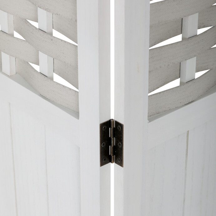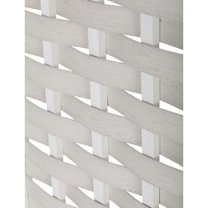 Trojdielny paraván z masívneho smrekového dreva v bielom prevedení ponúka praktické riešenie na rozdelenie priestoru či vytvorenie súkromia v interiéri. Pevné rámové telo je doplnené o dekoratívnu prepletanú PVC výplň, ktorá dodáva paravánu zaujímavý vizuálny efekt a zároveň umožňuje čiastočnú priechodnosť svetla. Vďaka trom otočným dielom je možné paraván ľahko prispôsobiť rôznym priestorovým požiadavkám a usporiadaniam. Povrchová úprava čiernym lakom zaisťuje odolnosť proti bežnému opotrebovaniu a jednoduchú údržbu. Rozmery a robustný materiál garantujú stabilitu a dlhú životnosť produktu. Rozmer jedného dielu je 40 x 171 cm. Rozmer jedného dielu je 40x171 cm.
