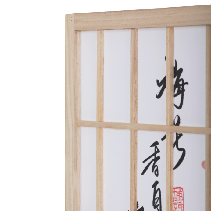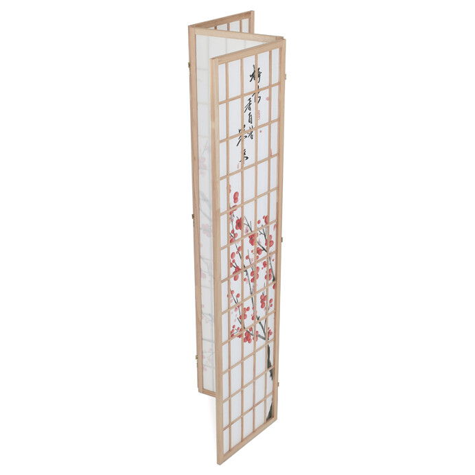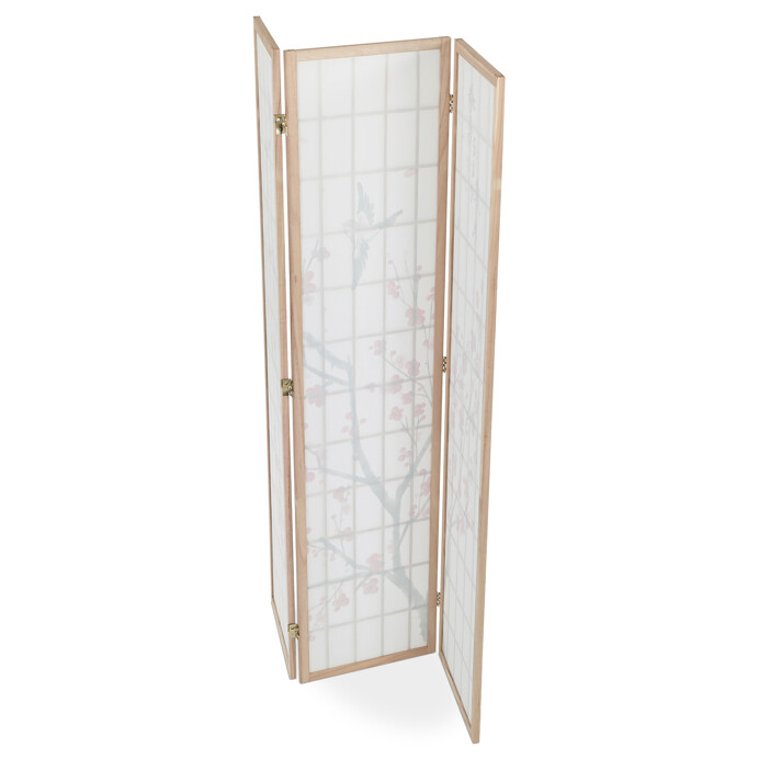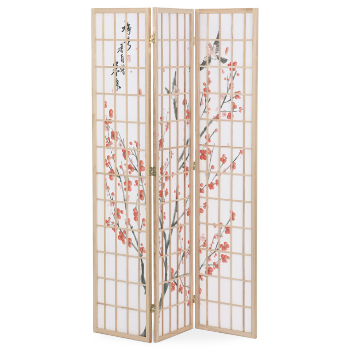 Trojdielny paraván z masívneho sprekového dreva v trójom odtieni úča ľahkú a žežnú priečku s bielou netkanou textíliou, ktorá je zdobená jemným motívom vetiev a kvetmi vyčičmi v čevných a roženových tónoch. Pevné drevené rámy zabbezpeczujú stabilitu a zároveň umožňujú jednoduché skladovanie presúvania. Paraván je vhodný na optické oddelenie priestoru a interiéru, pričom svojou prirodzenou farbou a decentným dekorom vytvára pokojné prostredie. Vďaka ľahkému materiálu sa ľahko udržiava a je ideálny pre použitie v obývacích izbách, spálňach alebo kanceláriách.