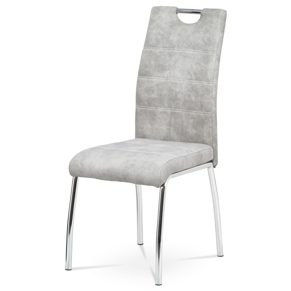 Moderná jedálenská stolička je čalúnená striebornou látkou COWBOY v dekore vintage kože as dekoratívnym bielym prešívaním sedadla i operadla. Pekný dizajn podtrhuje kovová podnož s chrómovou úpravou. Podnož je navyše špeciálne tvarovaná pre lepšiu stabilitu a bezpečie. Každá zo štyroch nôh je na čiernom plastovom klzáku, čo zníži riziko poškodenia Vašej podlahy. Pre ľahšiu manipuláciu má stoličky aj madlo v hornej časti operadla, ktoré je kovové a tiež s chrómovou úpravou. Nosnosť stoličky je až 110 kg.