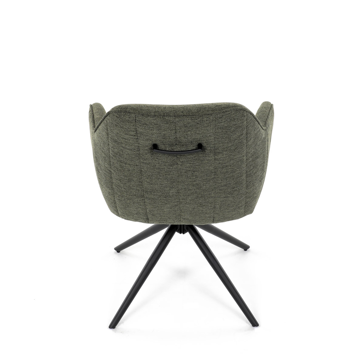 Moderná jedálenská stolička v zelenej farbe s efektným prešitím chrbtovej aj prednej časti operadla. Prešitie je v brve poťahového materiálu. Zadná časť operadla je opatrená vkusným madlom pre ľahšiu manipuláciu. Štyri kovové nohy v matnom práškovom nástreku vychádzajú z centrálneho bodu v strede sedadla. Sedák je otočný o P90 ° L 90 ° s vratným mechanizmom - funkcia reset.
