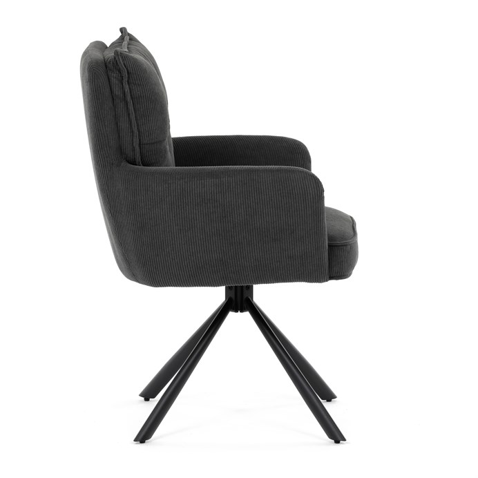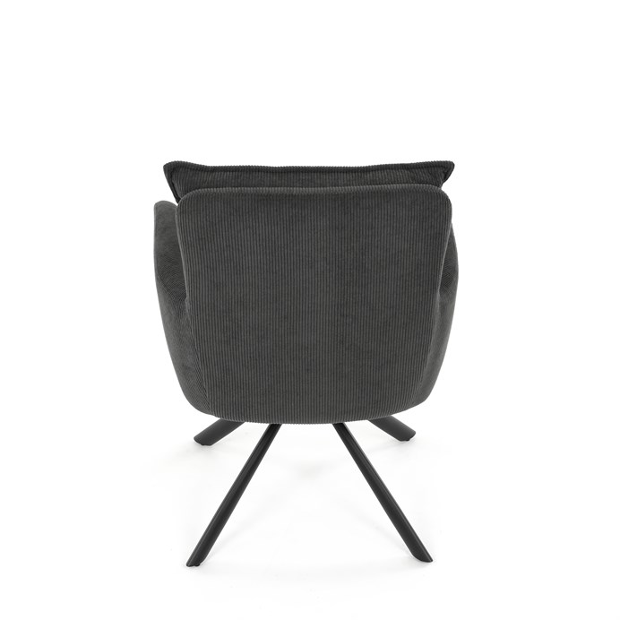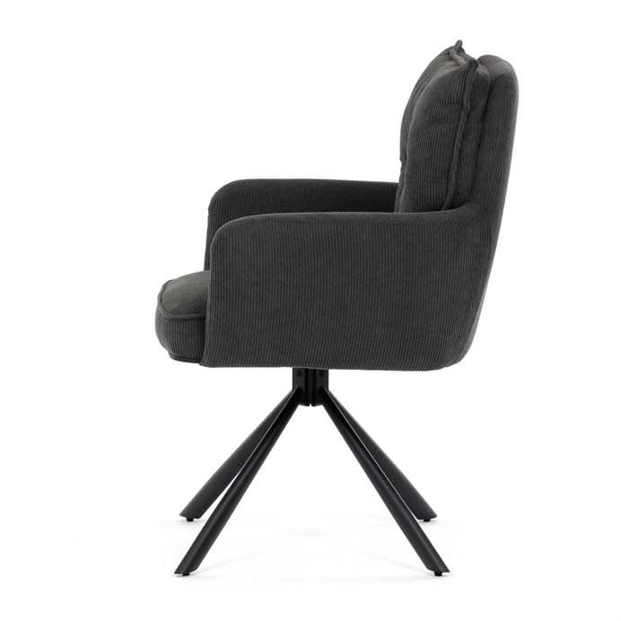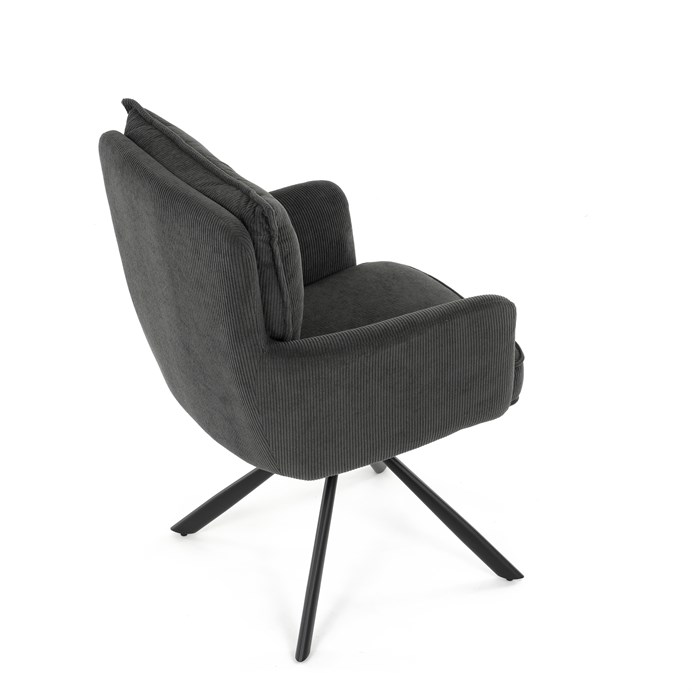 Jedálenská stolička s označením HC-X1128 GREY2 ponúka komfortné sedenie vďaka vysokému polstrovaniu sedáka a operadla potiahnutých sivou manšestrovou látkou, ktorá je príjemná na dotyk a ľahko sa udržiava. Sedák je vybavený taštičkovými pružinami, ktoré zvyšujú pohodlie a prispievajú k dlhodobej elasticite. Stolička disponuje otočnou funkciou s možnosťou otáčania o 180° a vratným mechanizmom reset, ktorý automaticky vracia stoličku do východzej polohy, čo uľahčuje manipuláciu a zvyšuje ergonómiu. Pevné čierne kovové nohy zabezpečujú stabilitu a odolnosť, pričom ich dizajn dodáva stoličke moderný vzhľad vhodný do rôznych interiérov. Podrúčky sú integrované v čalúnení, čo podporuje pohodlné opretie rúk počas sedenia.