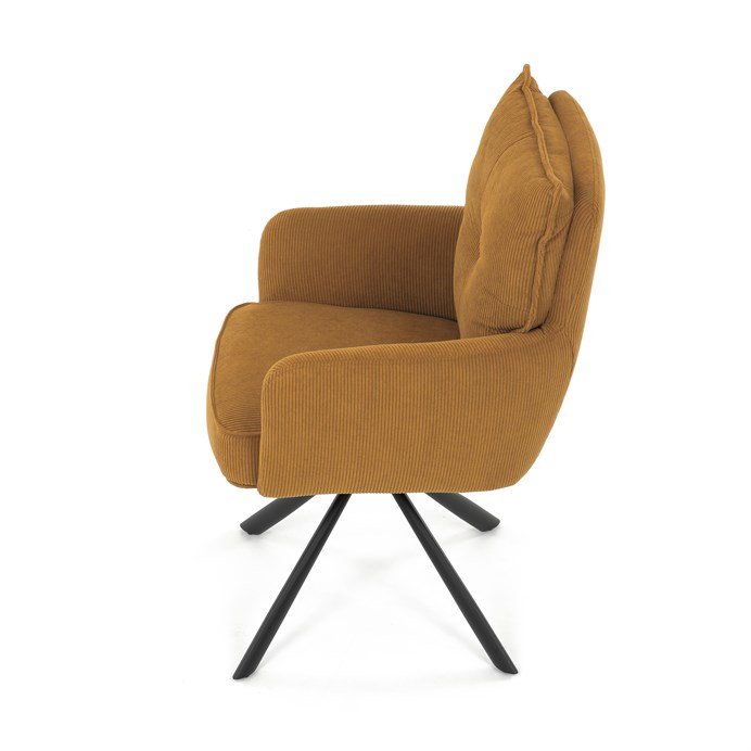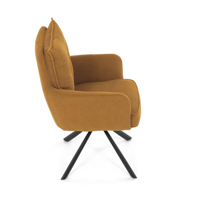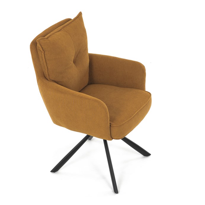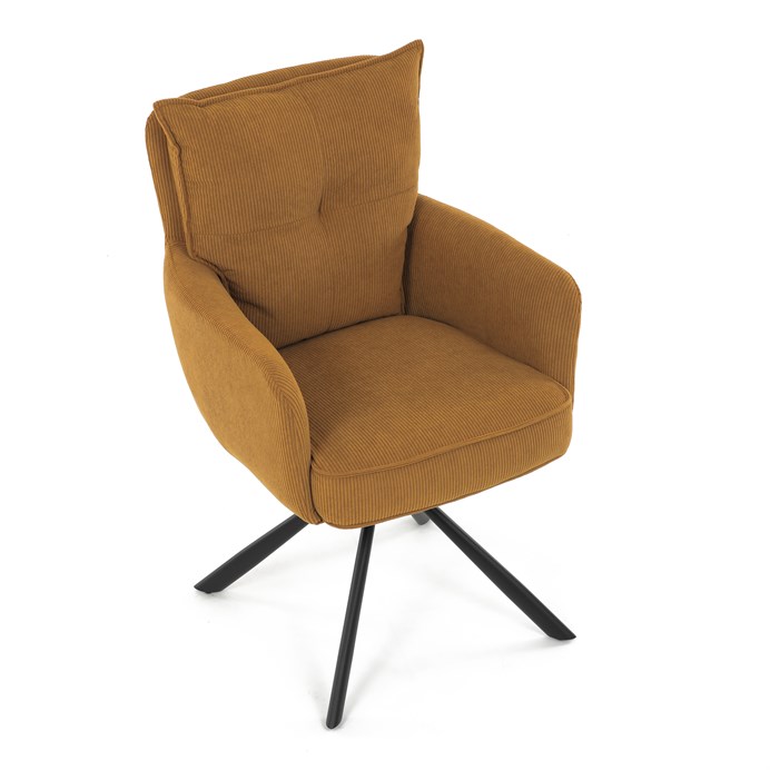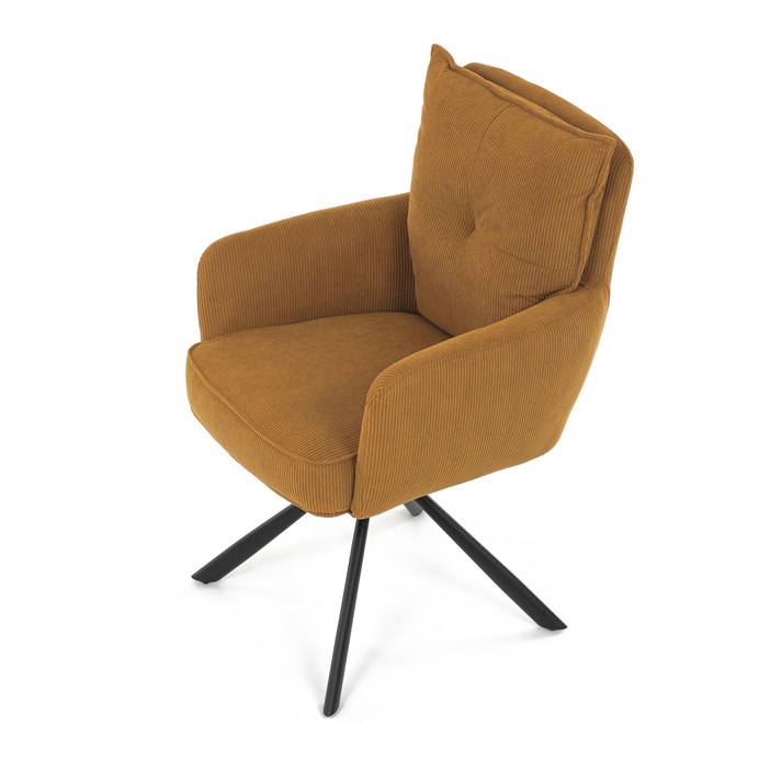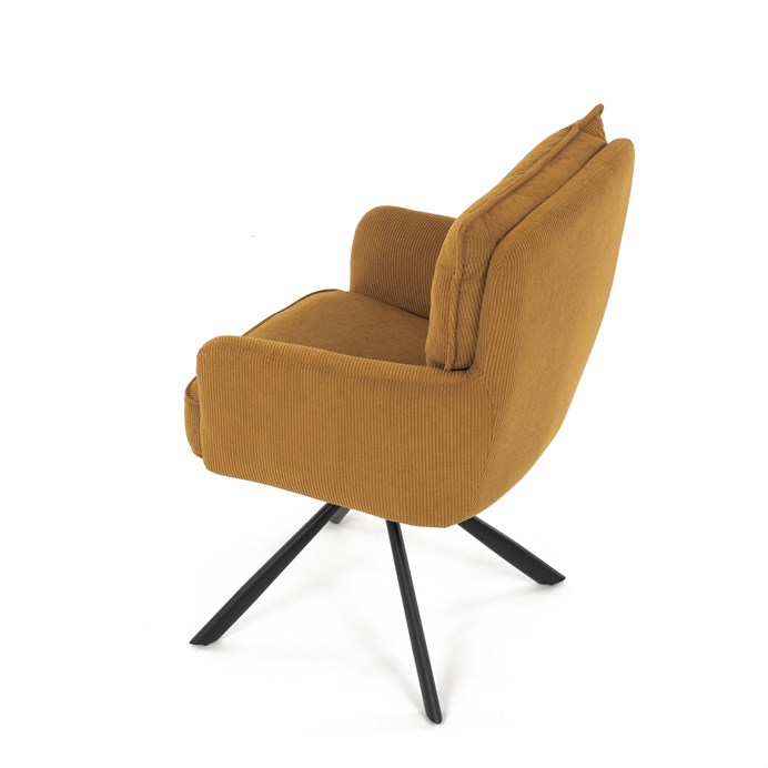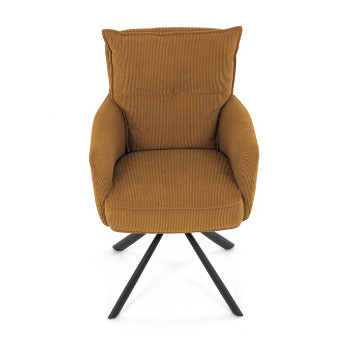 Jedálenská stolička s označením HC-X1128 YEL2 ponúka komfortné sedenie vďaka vysokému polstrovaniu sedáku a operadla potiahnutých žltou menčestrovou látkou, ktorá je príjemná na dotyk a ľahko sa udržuje. Sedák je vybavený taštičkovými pružinami, ktoré zvyšujú pohodlie a prispievajú k dlhodobej elasticite. Stolička disponuje otočnou funkciou s možnosťou otáčania o 180 ° a vratným mechanizmom reset, ktorý automaticky vracia stoličku do východiskovej polohy, čo uľahčuje manipuláciu a zvyšuje ergonómiu. Pevné čierne kovové nohy zaisťujú stabilitu a odolnosť, pričom ich design dodáva stoličke moderný vzhľad vhodný do rôznych interiérov. Podrúčky sú integrované v čalúnení, čo podporuje pohodlné opretie rúk počas sedenia.
