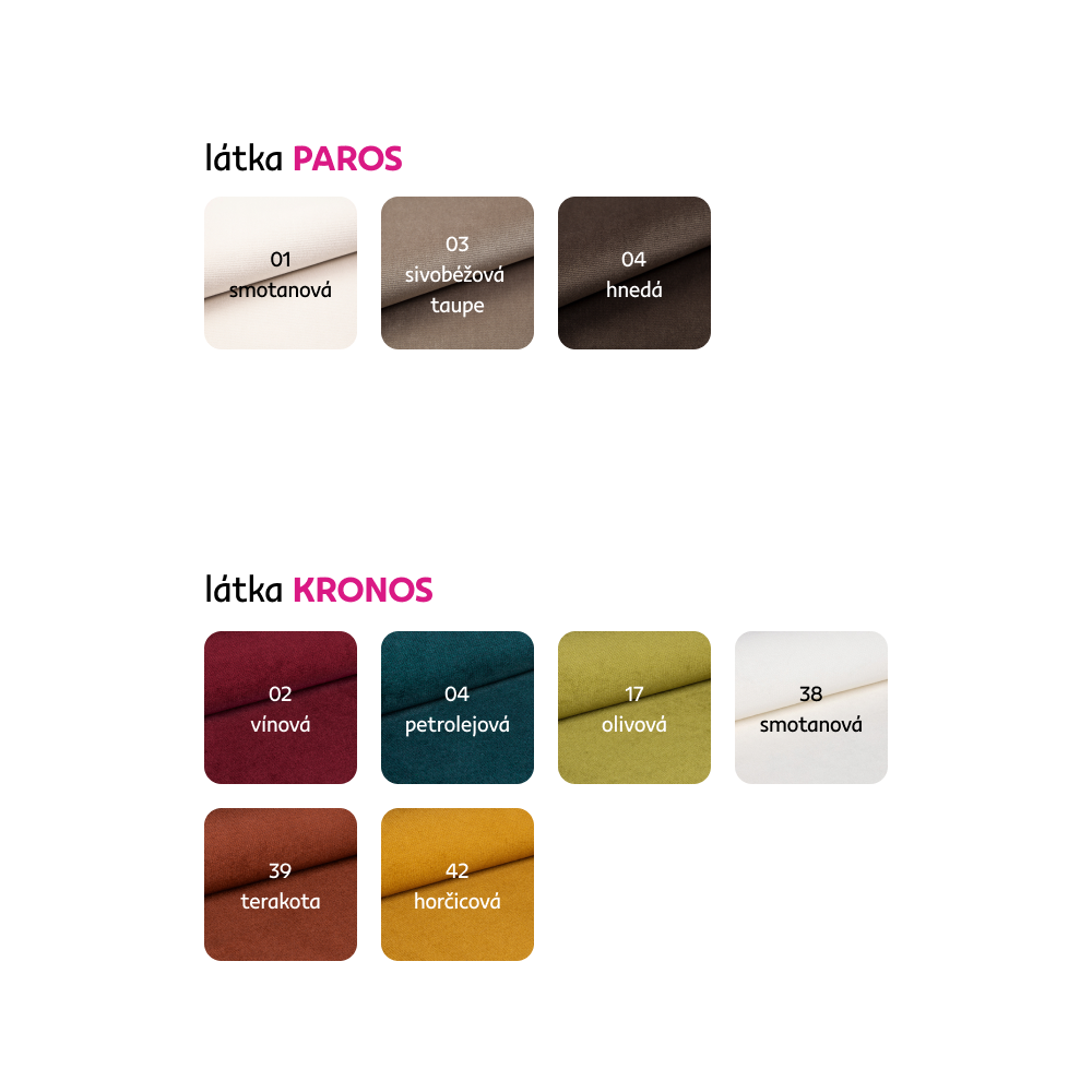 Možnosť objednania v 3 farebných odtieňoch látky Paros a v 6 farebných odtieňoch látky Kronos s možnosťou výberu drevených nožičiek vo farbe biela, čierna, buk alebo orech v cene 369 Eur s dodacou lehotou 6-8 týždňov. Pri individuálnej objednávke je potrebné zaplatiť 20% zálohu z danej sumy. Po uhradení zálohy bude Vaša požiadavka zadaná do výroby.