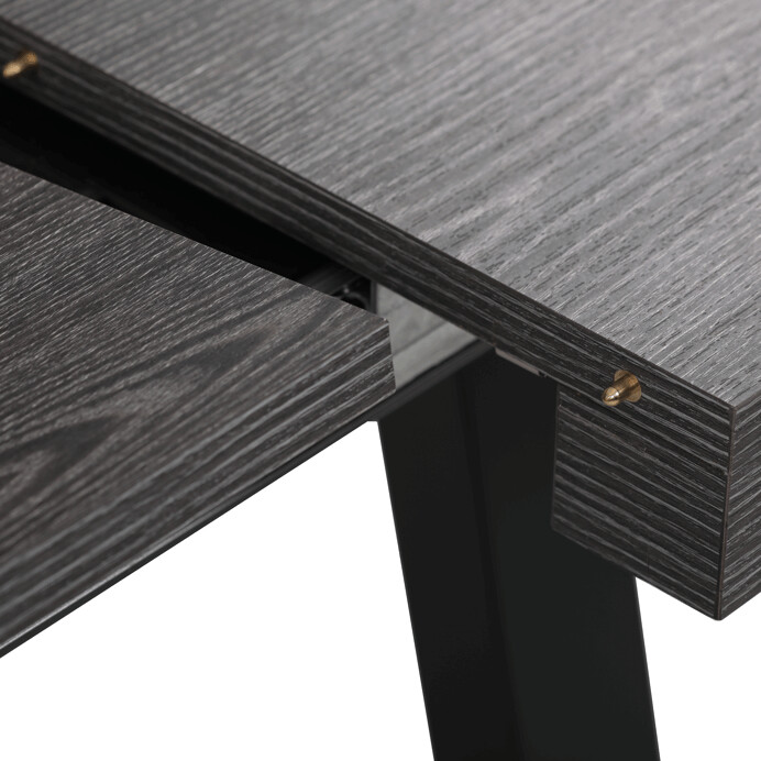 Jedálenský stôl HT-R5624 GREY ponúka praktické rozkladanie s celkovými rozmermi 160+80x90x75 cm, čo umožňuje flexibilné využitie priestoru. Doska je vyrobená z lamina s dekorom sivého dubu a je opatrená ABS hranou, ktorá zvyšuje odolnosť proti poškodeniu a uľahčuje údržbu. Matný povrch dodáva stolovej doske moderný vzhľad a zároveň minimalizuje viditeľnosť odtlačkov prstov. Stabilná kovová podnož v čiernej farbe zabezpečuje pevnú oporu a dlhú životnosť stola. Vďaka rozkladaciemu mechanizmu je stôl vhodný na každodenné použitie aj pre väčšie spoločenské udalosti.