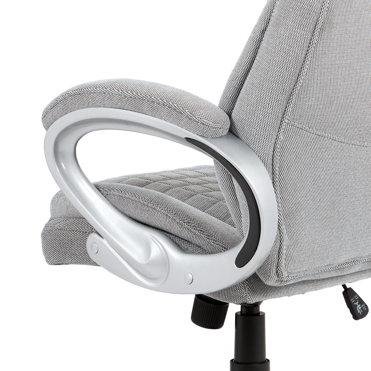 Pohodlné kancelárske kreslo očalúnené na dotyk príjemnou no zároveň pružnú svetlo-sivú látkou vzor Pepito. Kríž je plastový v striebornej farbe a stolička je vybavená húpacím mechanizmom.