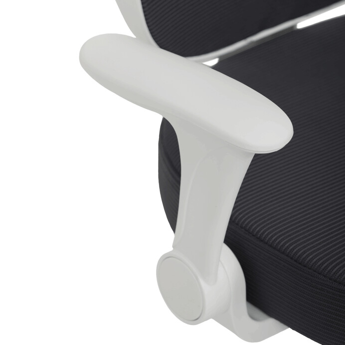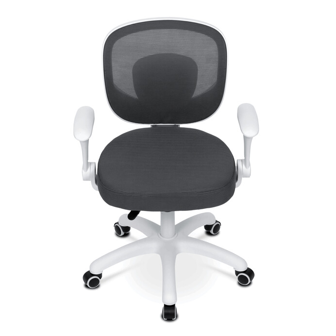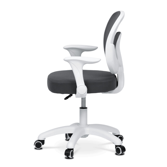 Detská stolička so sivým sieťovinovým poťahom ponúka priedušné a pohodlné sedenie vhodné pre mladších používateľov. Operadlo je z ľahkej a pevnej sieťoviny, ktorá podporuje cirkuláciu vzduchu, zatiaľ čo sedák je čalúnený látkou rovnakej farby pre príjemný komfort. Biele plastové nohy s piatimi ramenami zabezpečujú stabilitu a sú vybavené kolieskami určenými na tvrdé podlahy, čo umožňuje ľahký pohyb bez poškodenia povrchu. Odklápacie podrúčky prispievajú k flexibilite používania a výškovo nastaviteľný mechanizmus umožňuje prispôsobenie výšky sedáka podľa potreby dieťaťa. Stolička je navrhnutá tak, aby kombinovala funkčnosť s jednoduchým dizajnom vhodným do detských izieb.