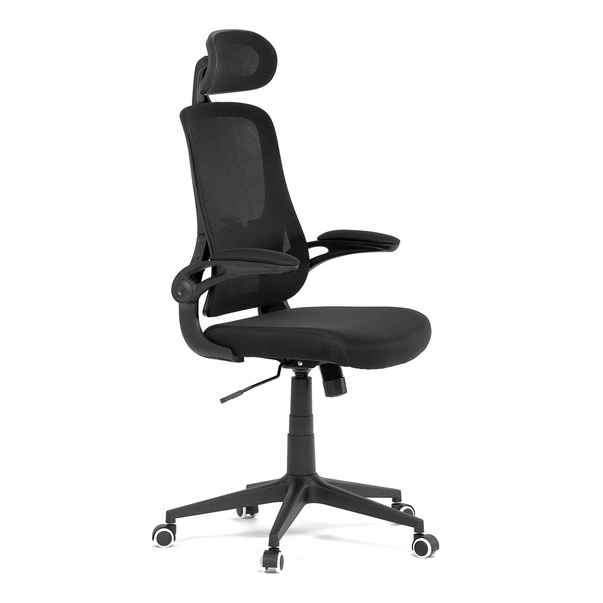 Kancelárska stolička v čiernej látke. Sedák a povrch zdvíhacích madiel je vystlaný a potiahnutý čiernou látkou. Výškovo nastaviteľný podhlavník. Kostra, podrúčky a kríž sú z odolného plastu.