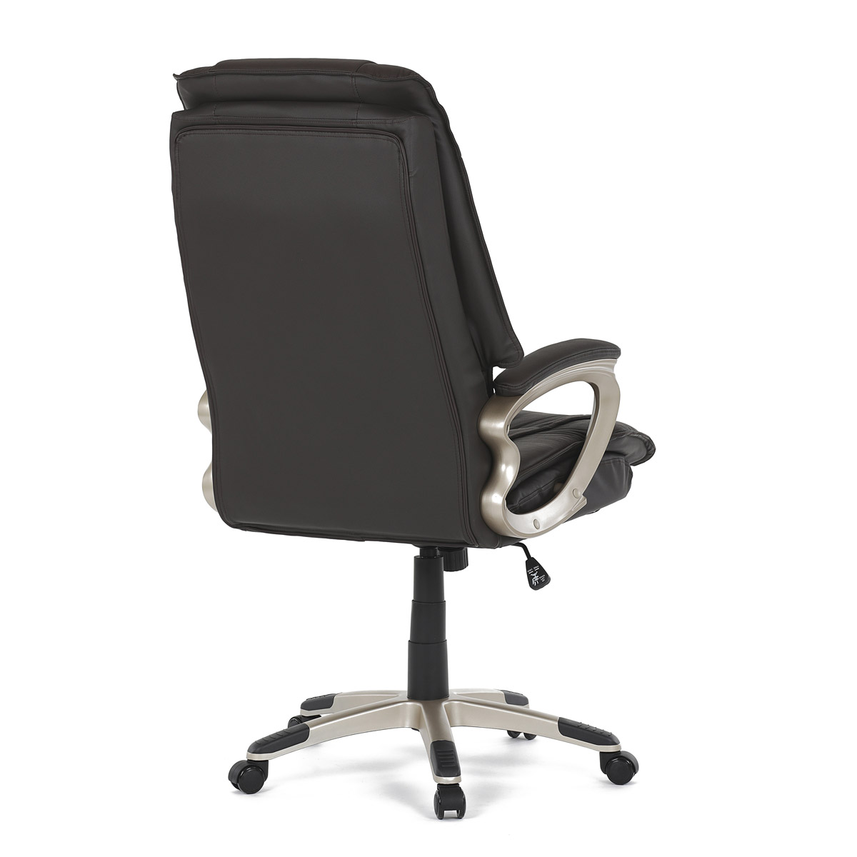 Manažérske kreslo v poťahu z tmavo hnedej ekokože. Kríž a podrúčky sú z odolného plastu v medenej farbe. Vrchná časť podrúčiek krytá mäkkým madlom v tmavo hnedej ekokoži. Pri kresle sú použité kolieska pre tvrdé povrchy.