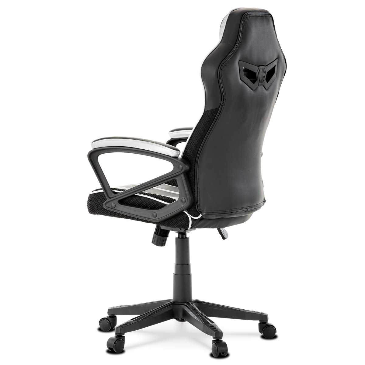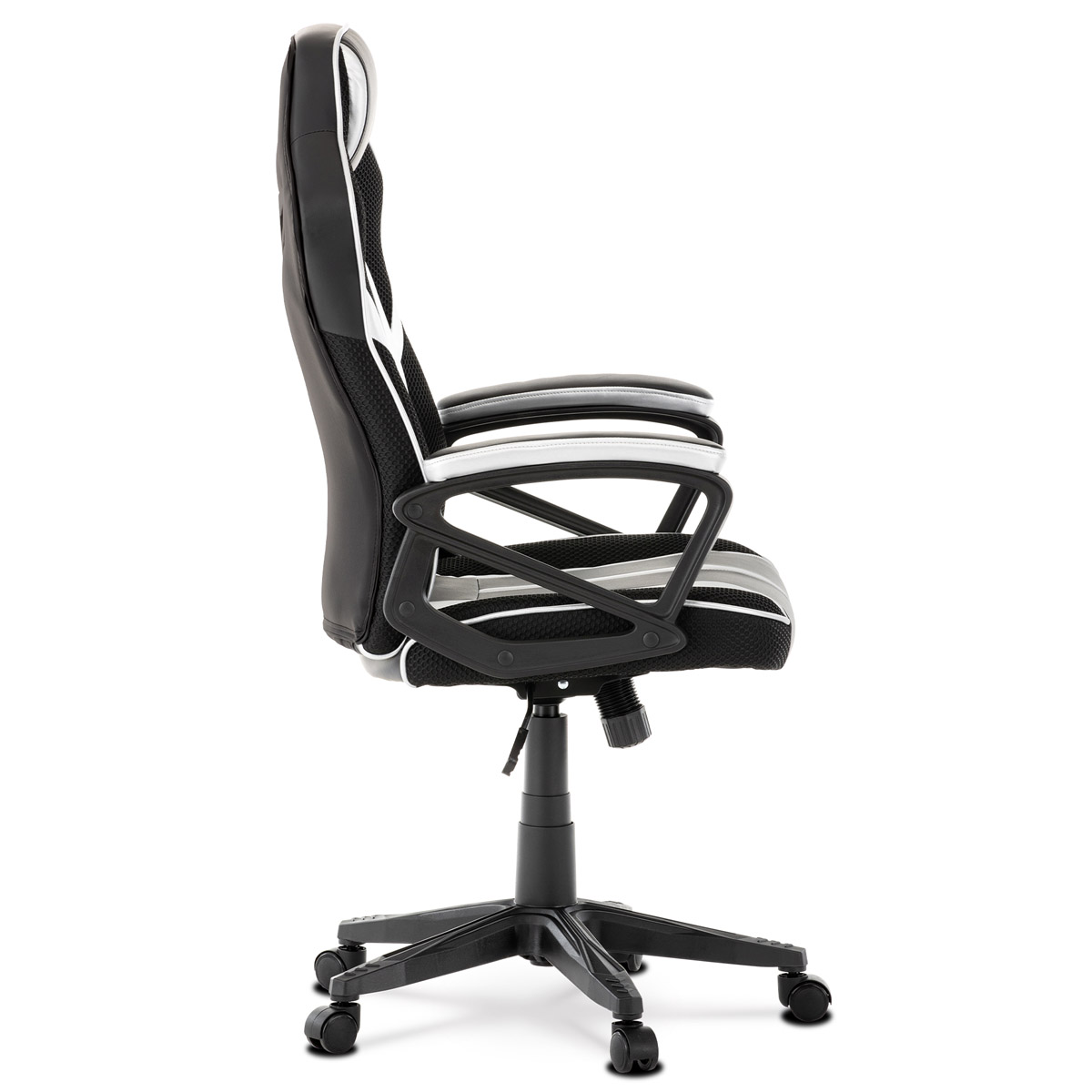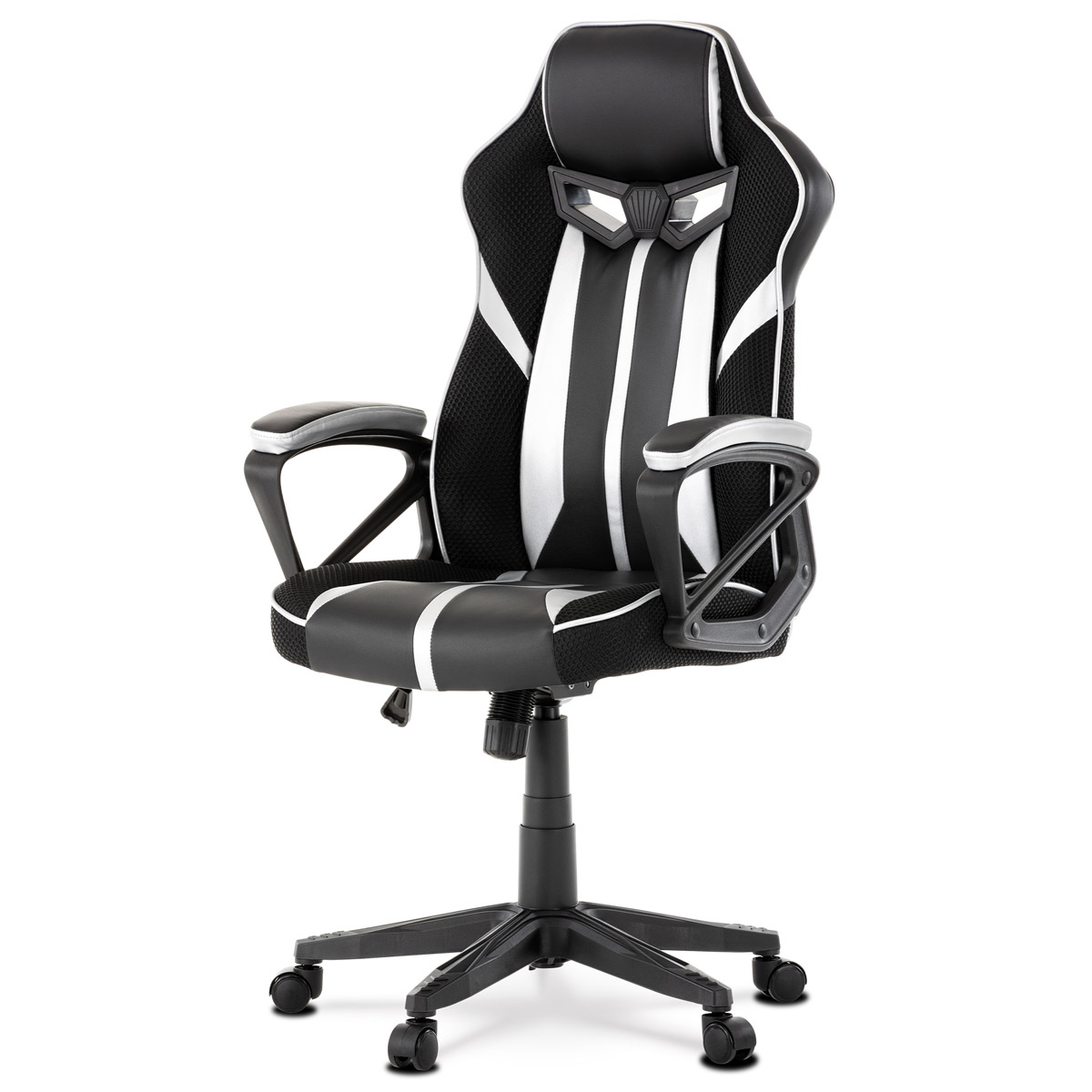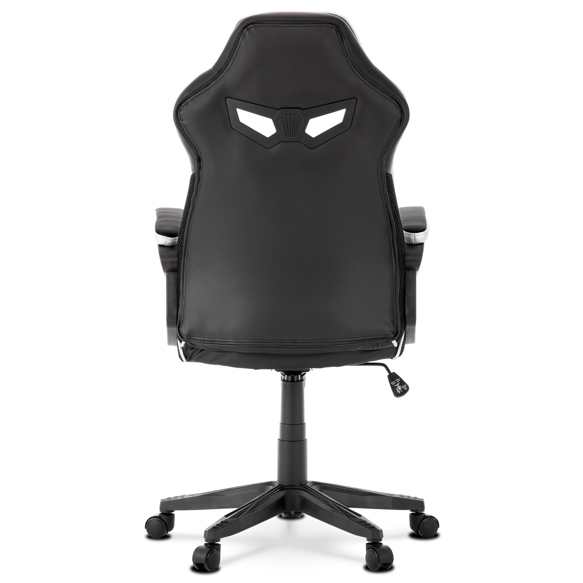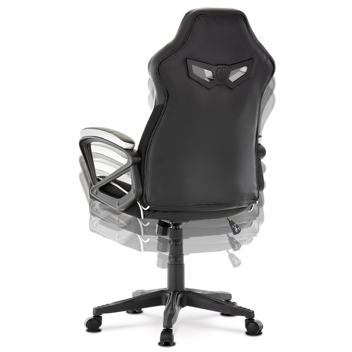 Elegantné herné kreslo v dizajne sedačky závodného vozidla v prevedení Dark Racing Style so zaoblenými líniami vo výraznom kontraste s ostro rezanými rysmi plastového lemovania otvorov na „bezpečnostné pásy“. Uprostred sú spojené výrazným prvkom v štylizovanom tvare mušle. Tieto dizajnové otvory v hornej časti operadla nielen potrebný závodný vzhľad, ale aj uľahčuje manipuláciu. Poťah je kombináciou čiernej látky MESH, doplnený väčšími prvkami z čiernej a striebornej ekokože. Obvodové prešitie je v čiernej farbe. Polstrovanie je z kvalitnej PU peny. Stolička je vybavená hojdacím mechanizmom s nastavením protiváhy a aretáciou v základnej polohe. Tuhosť protiváhy je možné regulovať veľkou plastovou skrutkou, umiestnenou pod sedákom. Výška sedenia sa upravuje páčkou na pravej strane cez kvalitný plynový piest. Znavené ruky z celodenného hrania či práce si môžete pohodlne položiť na podrúčky, na ložnej ploche polstrovanej čiernou a na obvodovej striebornou ekokožou. Šírka podrúčiek je 8 cm, ložná plocha 36 cm a výška 3 cm. Operadlo je vyššie, s integrovanou statickou opierkou hlavy. Kríž je veľký čierny plastový s priemerom 64 cm, čo zaisťuje dokonalú stabilitu aj pri fyzicky náročnejších hrách. Na koncoch ramien kríža sú v čiernej farbe výrazné protišmykové plochy. Kolieska sú plastové pr. 5 cm s čiernou obvodovou gumou, vhodná na tvrdé podlahy. Nosnosť stoličky je až 130 kg. Táto stolička nesklame a zaručí pohodlie aj pohodu pri akejkoľvek činnosti, kde ju bude potrebné a ešte bude v interiéri vďaka svojim decentným tvarom a farebnosti neprehliadnuteľným prvkom.