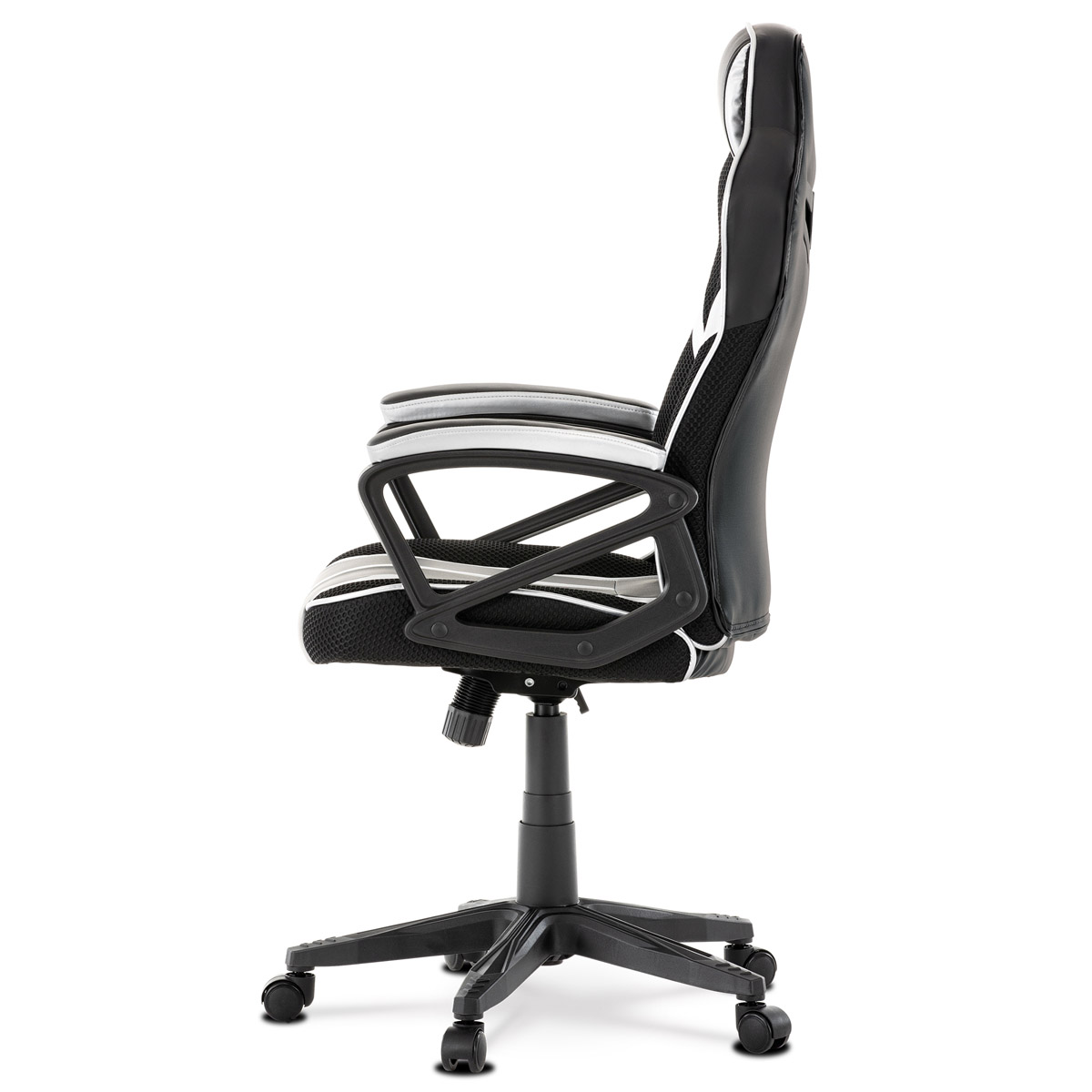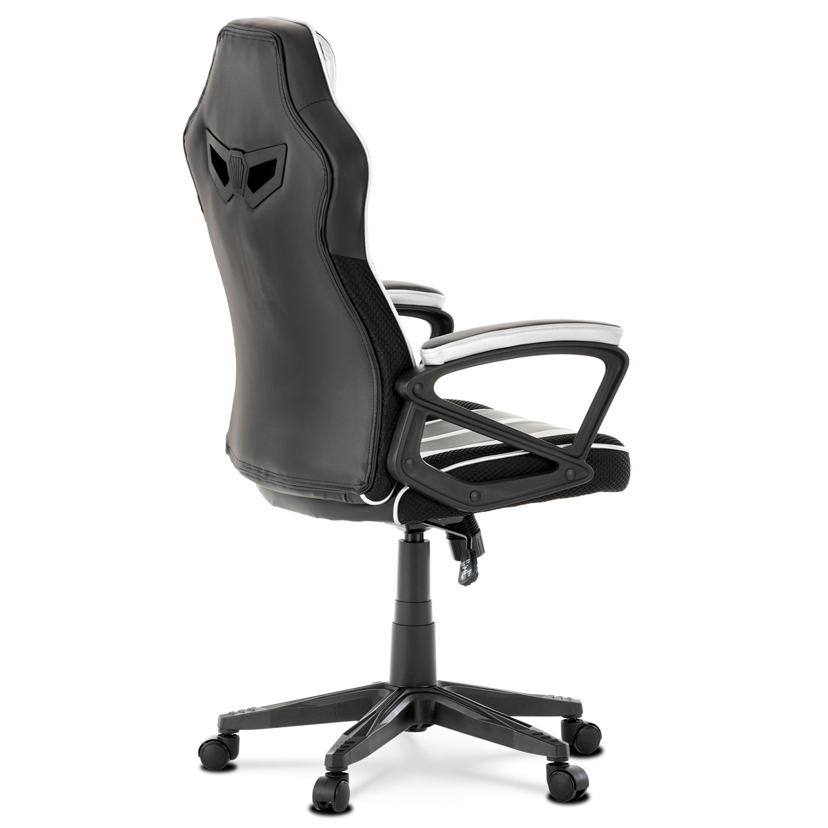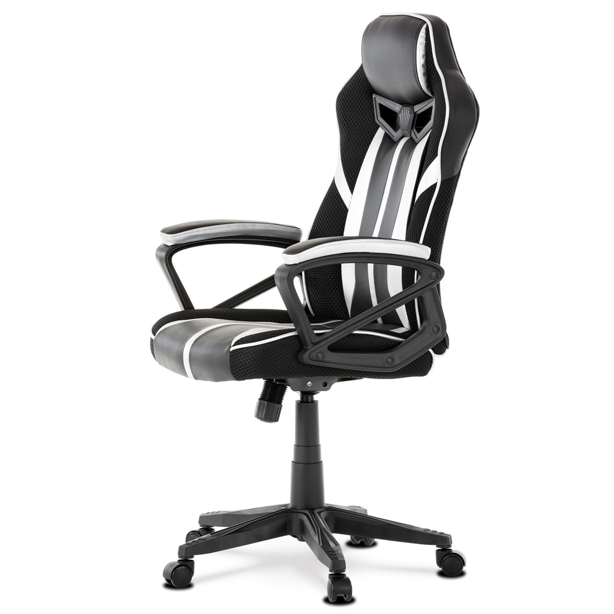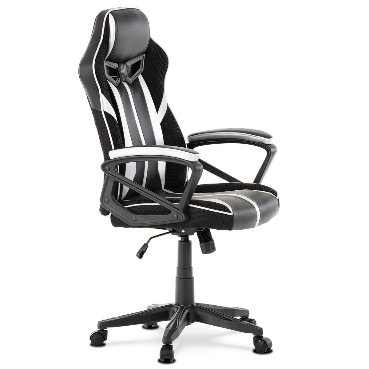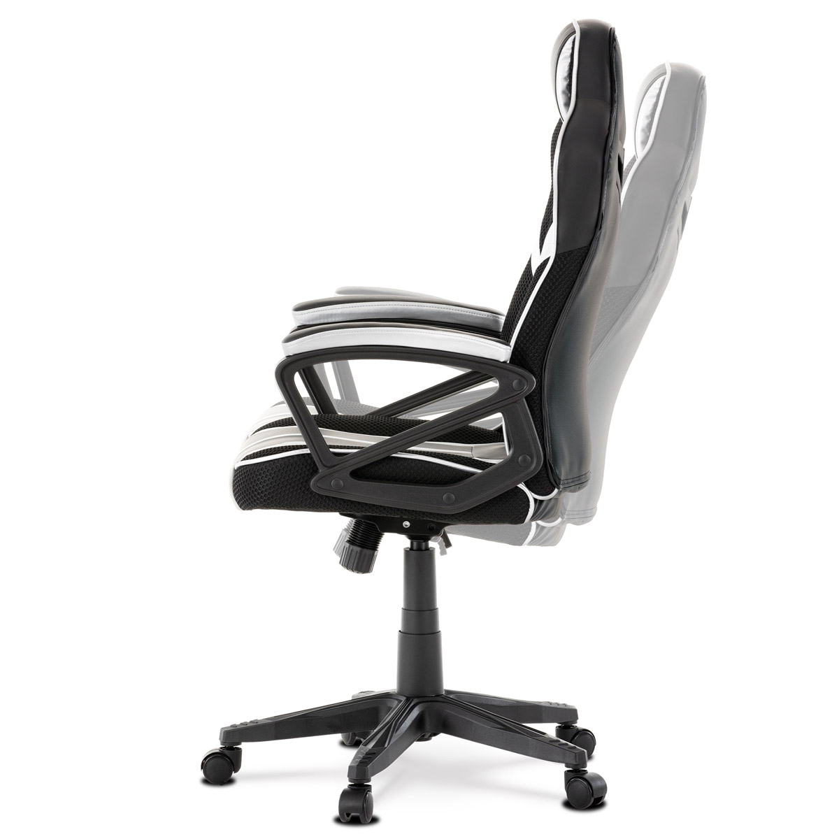 Elegantné herné kreslo v dizajne sedačky závodného vozidla v prevedení Dark Racing Style so zaoblenými líniami vo výraznom kontraste s ostro rezanými rysmi plastového lemovania otvorov na „bezpečnostné pásy“. Uprostred sú spojené výrazným prvkom v štylizovanom tvare mušle. Tieto dizajnové otvory v hornej časti operadla nielen potrebný závodný vzhľad, ale aj uľahčuje manipuláciu. Poťah je kombináciou čiernej látky MESH, doplnený väčšími prvkami z čiernej a striebornej ekokože. Obvodové prešitie je v čiernej farbe. Polstrovanie je z kvalitnej PU peny. Stolička je vybavená hojdacím mechanizmom s nastavením protiváhy a aretáciou v základnej polohe. Tuhosť protiváhy je možné regulovať veľkou plastovou skrutkou, umiestnenou pod sedákom. Výška sedenia sa upravuje páčkou na pravej strane cez kvalitný plynový piest. Znavené ruky z celodenného hrania či práce si môžete pohodlne položiť na podrúčky, na ložnej ploche polstrovanej čiernou a na obvodovej striebornou ekokožou. Šírka podrúčiek je 8 cm, ložná plocha 36 cm a výška 3 cm. Operadlo je vyššie, s integrovanou statickou opierkou hlavy. Kríž je veľký čierny plastový s priemerom 64 cm, čo zaisťuje dokonalú stabilitu aj pri fyzicky náročnejších hrách. Na koncoch ramien kríža sú v čiernej farbe výrazné protišmykové plochy. Kolieska sú plastové pr. 5 cm s čiernou obvodovou gumou, vhodná na tvrdé podlahy. Nosnosť stoličky je až 130 kg. Táto stolička nesklame a zaručí pohodlie aj pohodu pri akejkoľvek činnosti, kde ju bude potrebné a ešte bude v interiéri vďaka svojim decentným tvarom a farebnosti neprehliadnuteľným prvkom.