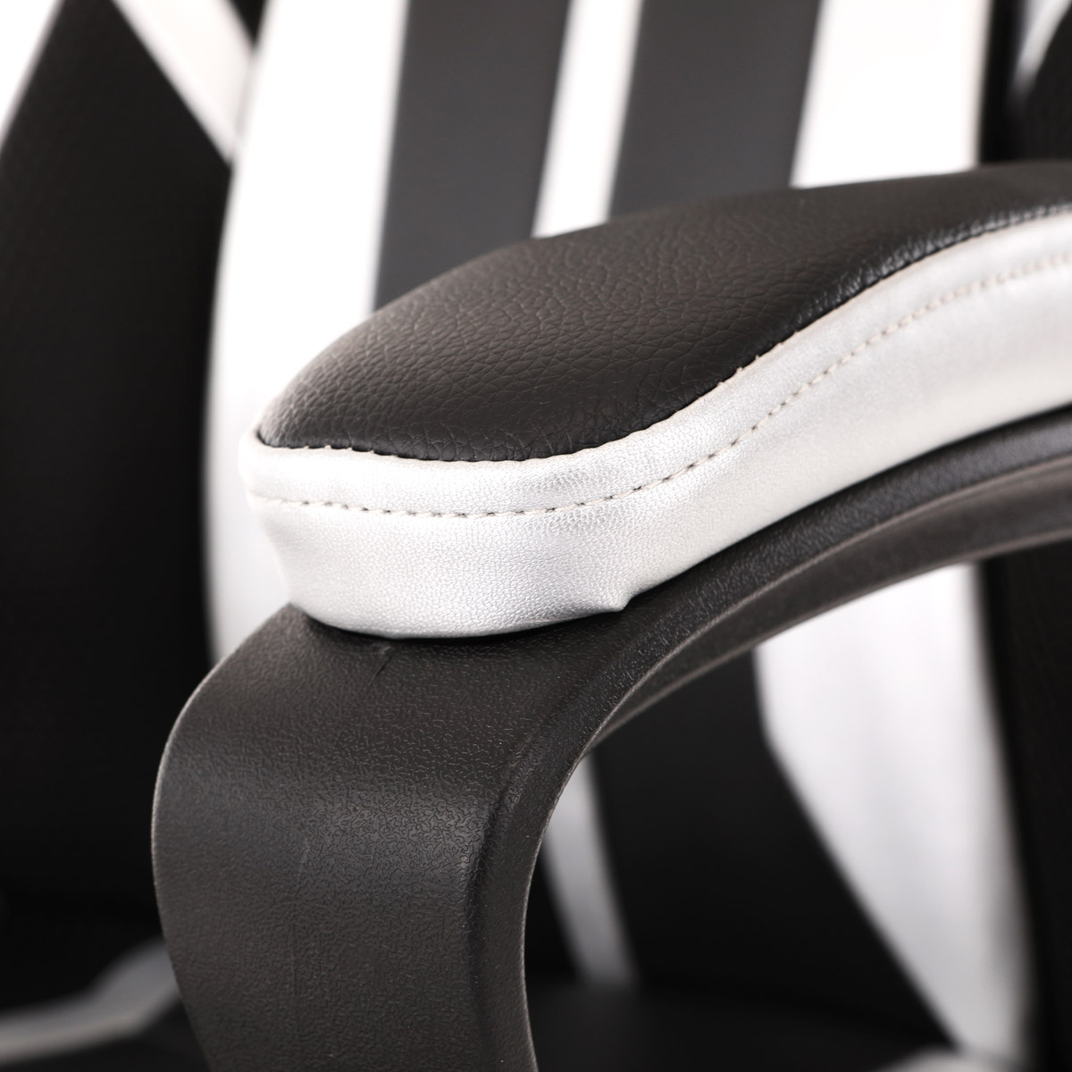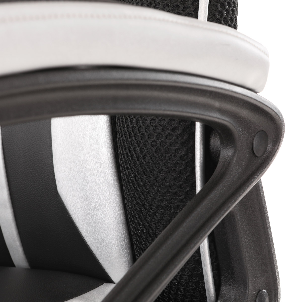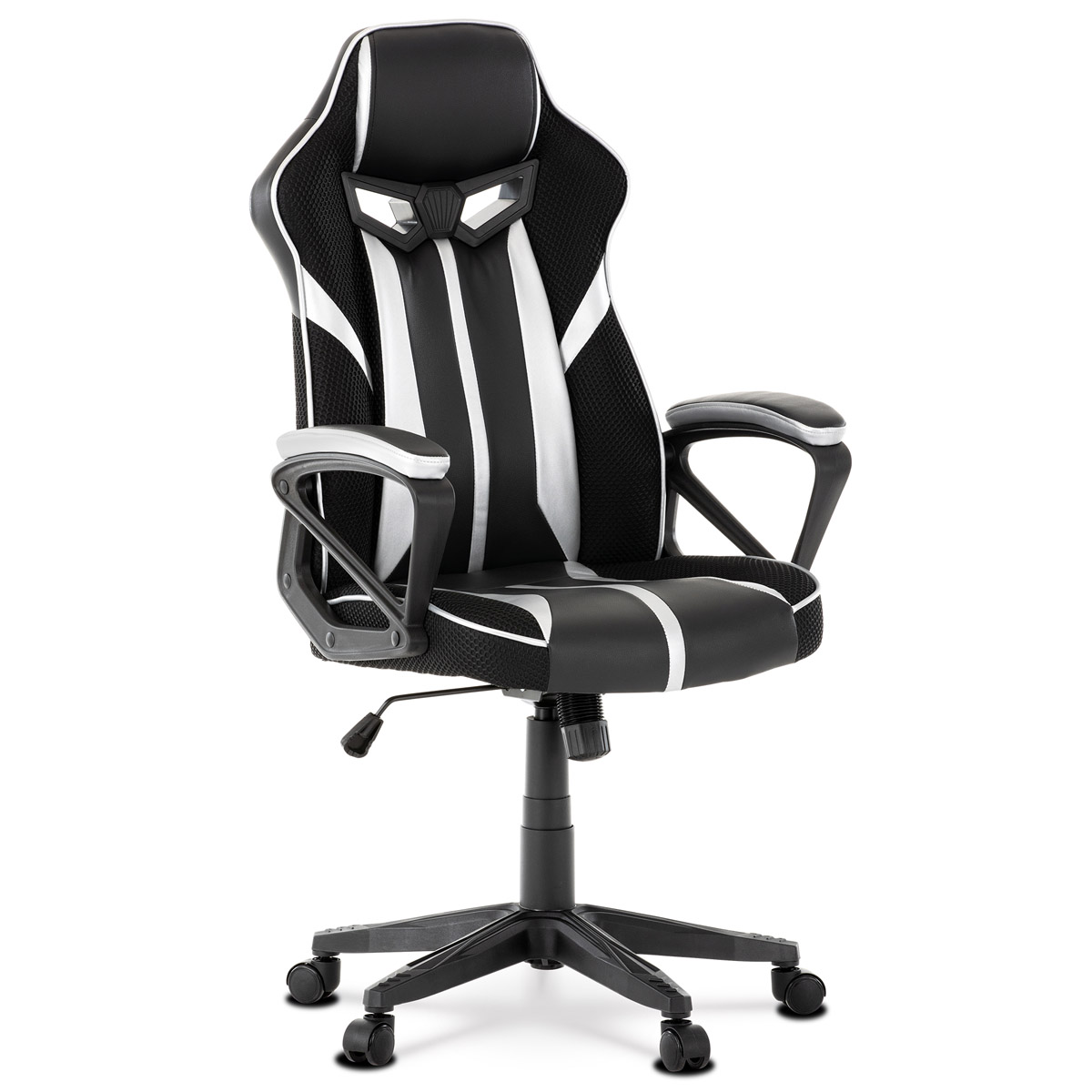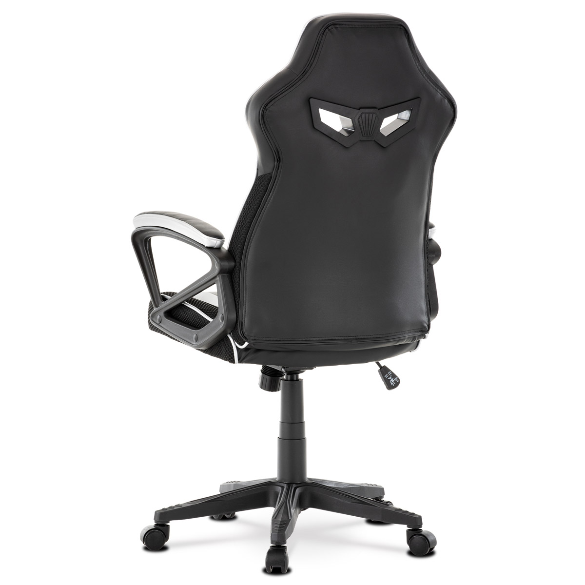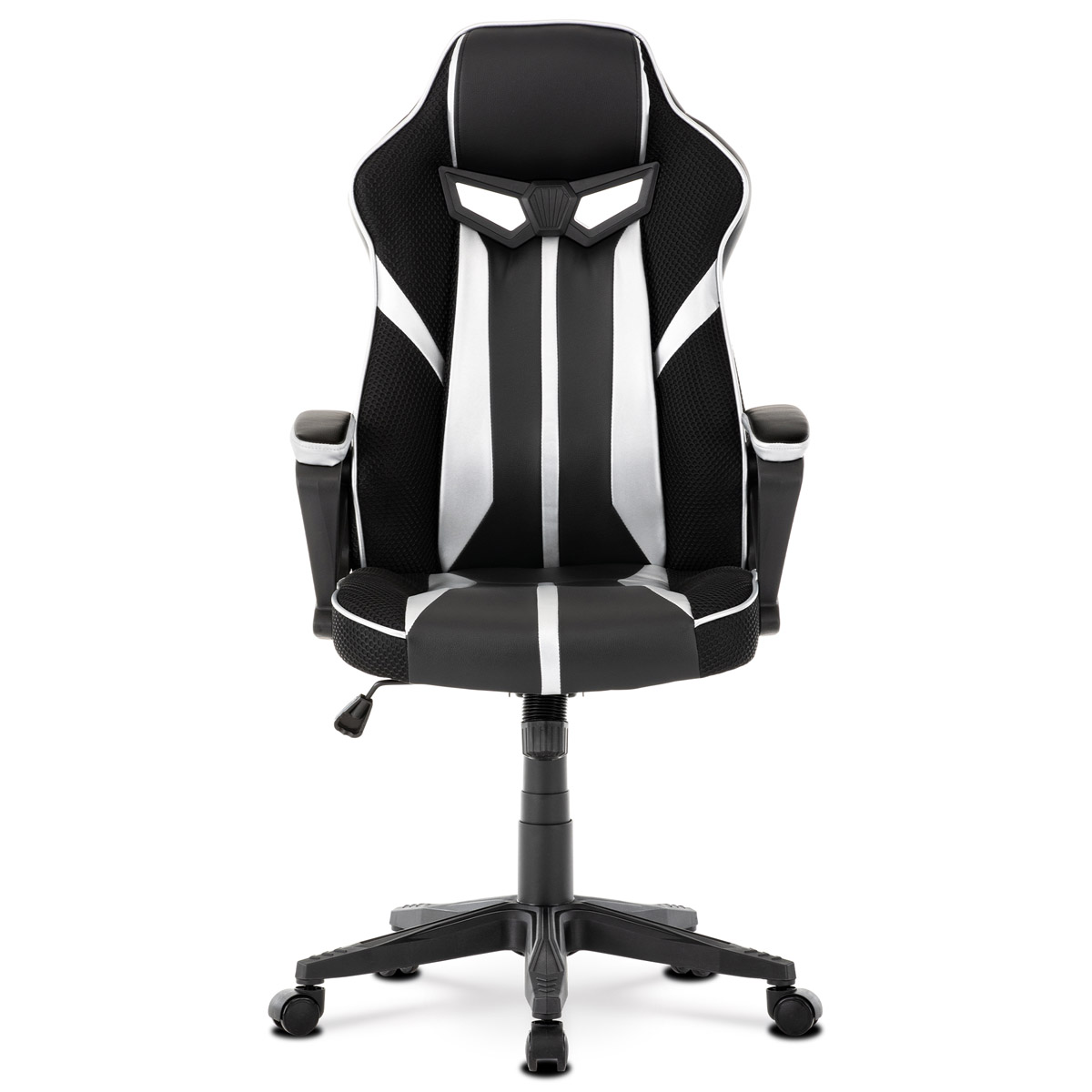 Elegantné herné kreslo v dizajne sedačky závodného vozidla v prevedení Dark Racing Style so zaoblenými líniami vo výraznom kontraste s ostro rezanými rysmi plastového lemovania otvorov na „bezpečnostné pásy“. Uprostred sú spojené výrazným prvkom v štylizovanom tvare mušle. Tieto dizajnové otvory v hornej časti operadla nielen potrebný závodný vzhľad, ale aj uľahčuje manipuláciu. Poťah je kombináciou čiernej látky MESH, doplnený väčšími prvkami z čiernej a striebornej ekokože. Obvodové prešitie je v čiernej farbe. Polstrovanie je z kvalitnej PU peny. Stolička je vybavená hojdacím mechanizmom s nastavením protiváhy a aretáciou v základnej polohe. Tuhosť protiváhy je možné regulovať veľkou plastovou skrutkou, umiestnenou pod sedákom. Výška sedenia sa upravuje páčkou na pravej strane cez kvalitný plynový piest. Znavené ruky z celodenného hrania či práce si môžete pohodlne položiť na podrúčky, na ložnej ploche polstrovanej čiernou a na obvodovej striebornou ekokožou. Šírka podrúčiek je 8 cm, ložná plocha 36 cm a výška 3 cm. Operadlo je vyššie, s integrovanou statickou opierkou hlavy. Kríž je veľký čierny plastový s priemerom 64 cm, čo zaisťuje dokonalú stabilitu aj pri fyzicky náročnejších hrách. Na koncoch ramien kríža sú v čiernej farbe výrazné protišmykové plochy. Kolieska sú plastové pr. 5 cm s čiernou obvodovou gumou, vhodná na tvrdé podlahy. Nosnosť stoličky je až 130 kg. Táto stolička nesklame a zaručí pohodlie aj pohodu pri akejkoľvek činnosti, kde ju bude potrebné a ešte bude v interiéri vďaka svojim decentným tvarom a farebnosti neprehliadnuteľným prvkom.