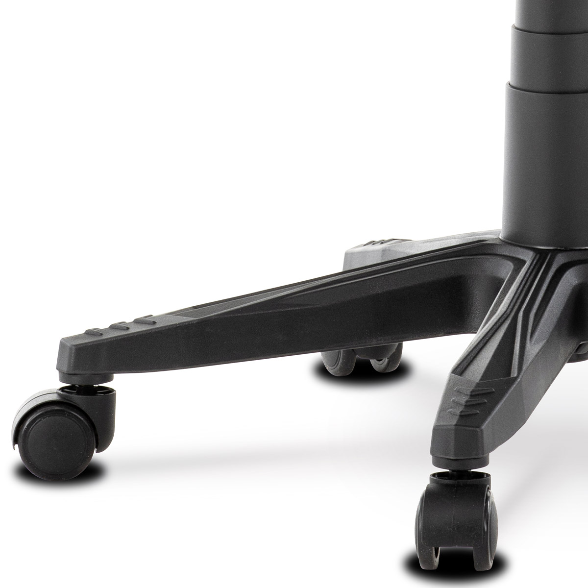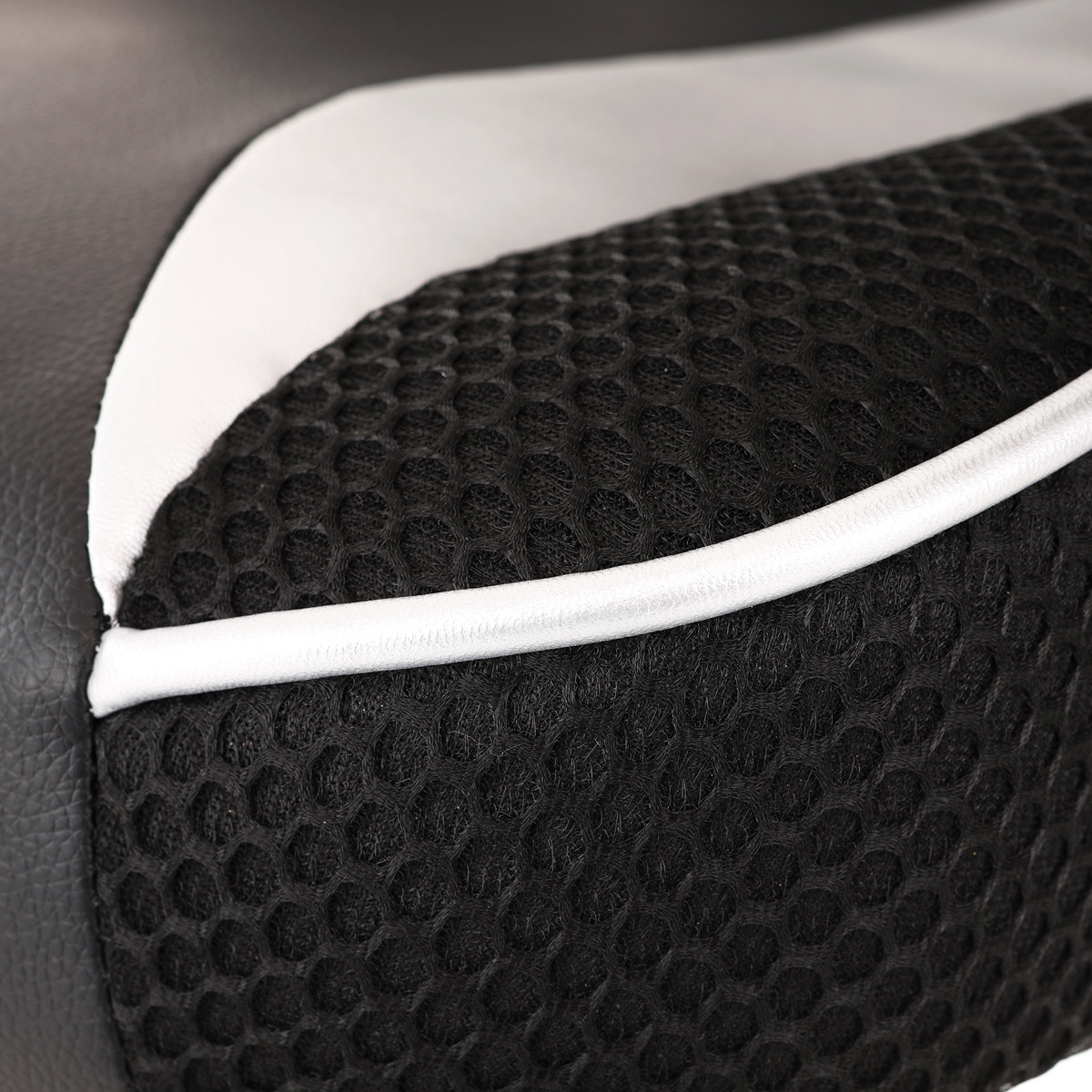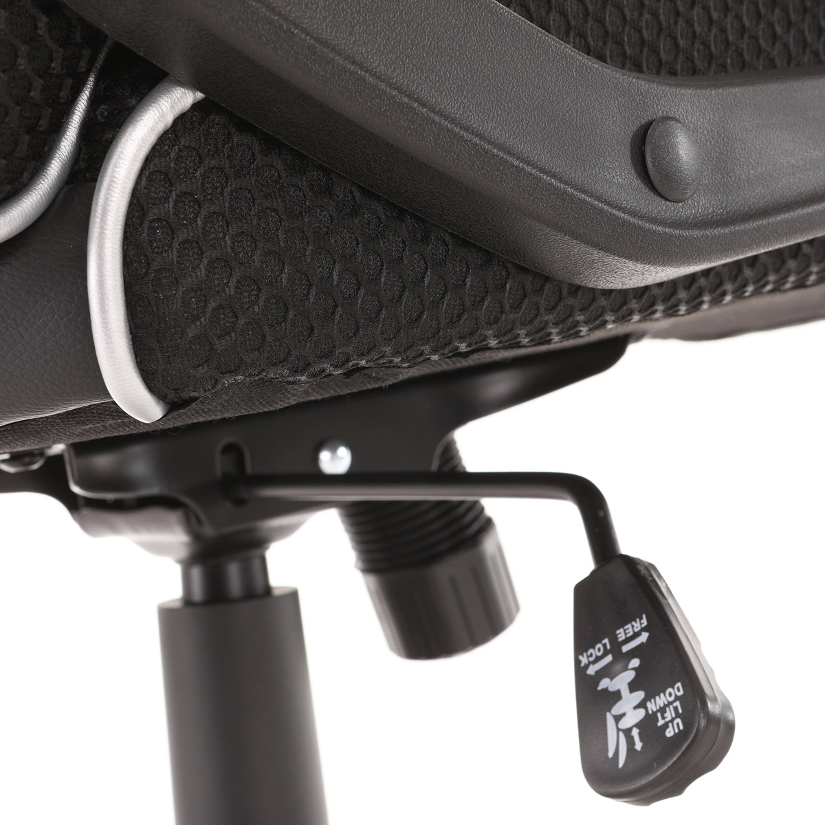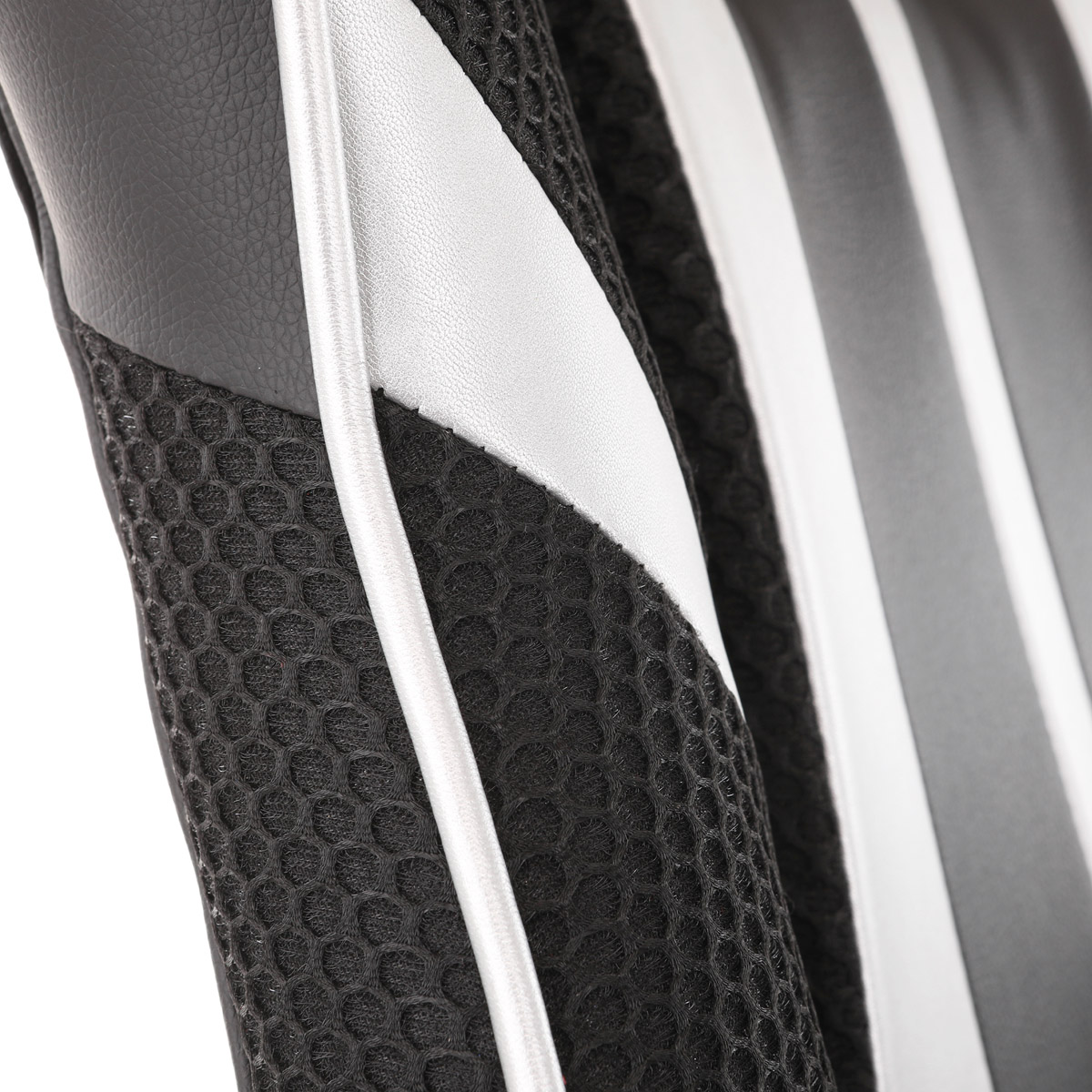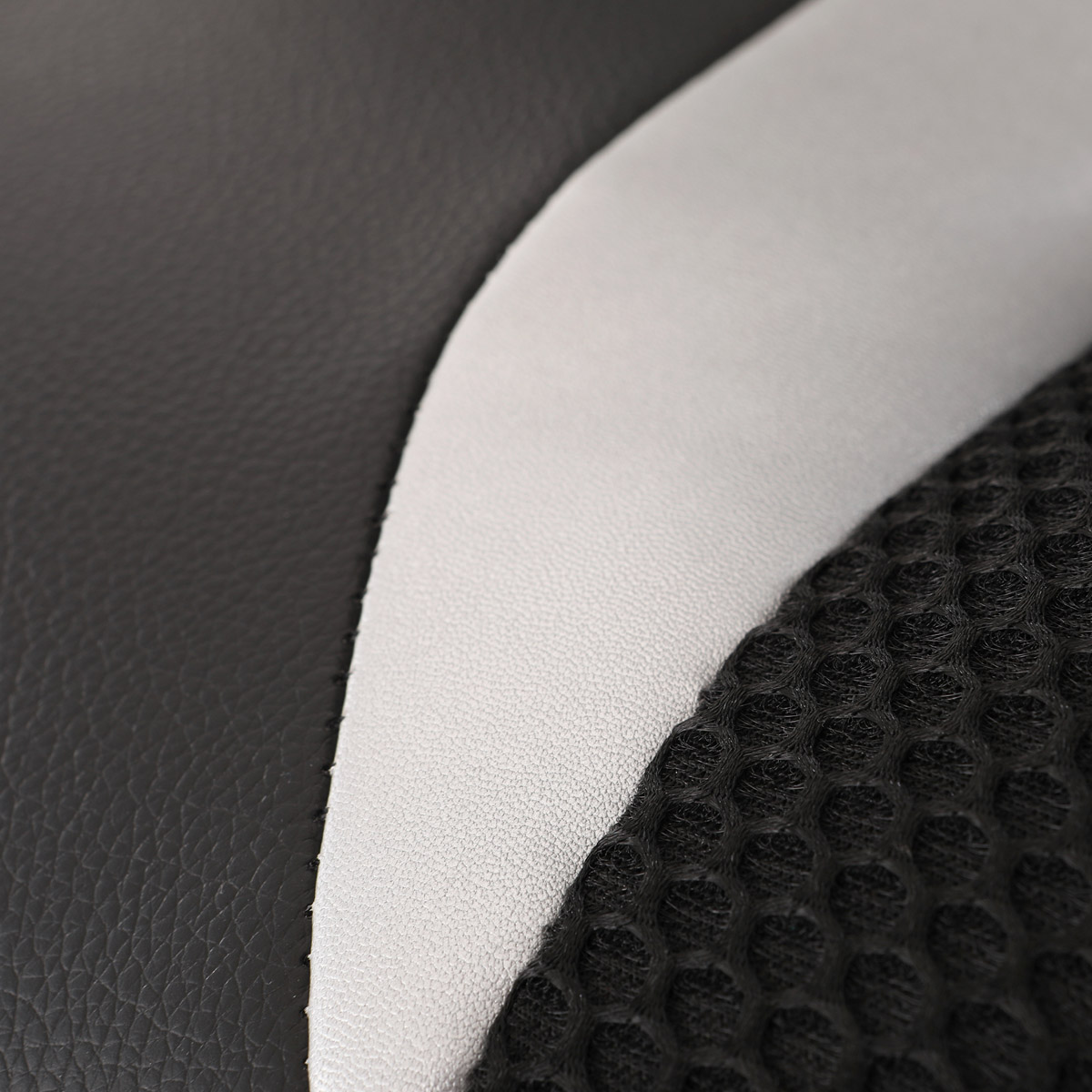 Elegantné herné kreslo v dizajne sedačky závodného vozidla v prevedení Dark Racing Style so zaoblenými líniami vo výraznom kontraste s ostro rezanými rysmi plastového lemovania otvorov na „bezpečnostné pásy“. Uprostred sú spojené výrazným prvkom v štylizovanom tvare mušle. Tieto dizajnové otvory v hornej časti operadla nielen potrebný závodný vzhľad, ale aj uľahčuje manipuláciu. Poťah je kombináciou čiernej látky MESH, doplnený väčšími prvkami z čiernej a striebornej ekokože. Obvodové prešitie je v čiernej farbe. Polstrovanie je z kvalitnej PU peny. Stolička je vybavená hojdacím mechanizmom s nastavením protiváhy a aretáciou v základnej polohe. Tuhosť protiváhy je možné regulovať veľkou plastovou skrutkou, umiestnenou pod sedákom. Výška sedenia sa upravuje páčkou na pravej strane cez kvalitný plynový piest. Znavené ruky z celodenného hrania či práce si môžete pohodlne položiť na podrúčky, na ložnej ploche polstrovanej čiernou a na obvodovej striebornou ekokožou. Šírka podrúčiek je 8 cm, ložná plocha 36 cm a výška 3 cm. Operadlo je vyššie, s integrovanou statickou opierkou hlavy. Kríž je veľký čierny plastový s priemerom 64 cm, čo zaisťuje dokonalú stabilitu aj pri fyzicky náročnejších hrách. Na koncoch ramien kríža sú v čiernej farbe výrazné protišmykové plochy. Kolieska sú plastové pr. 5 cm s čiernou obvodovou gumou, vhodná na tvrdé podlahy. Nosnosť stoličky je až 130 kg. Táto stolička nesklame a zaručí pohodlie aj pohodu pri akejkoľvek činnosti, kde ju bude potrebné a ešte bude v interiéri vďaka svojim decentným tvarom a farebnosti neprehliadnuteľným prvkom.
