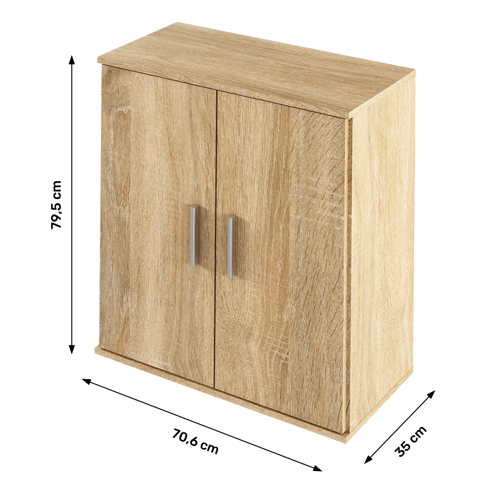 Materiál: DTD laminovaná Farba: dub sonoma Rozmery (ŠxHxV): 70,6x35x79,5 cm Dvojdverová Policová S úchytkami Dodávané v demonte