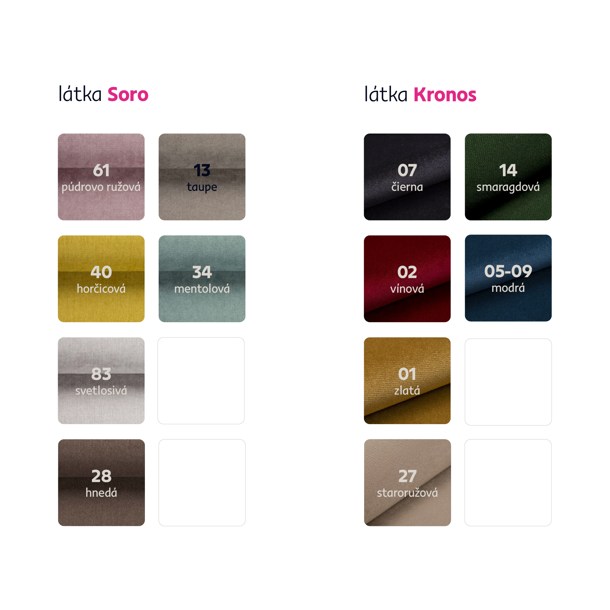 Možnosť objednania v 6 farebných prevedeniach látky Soro alebo látky Kronos, doba dodania 8-10 týždňov, cena v látke Soro a Kronos je 279 Eur. Pri individuálnej objednávke je potrebné zaplatiť 20% zálohu z danej sumy. Po uhradení zálohy bude Vaša požiadavka zadaná do výroby.