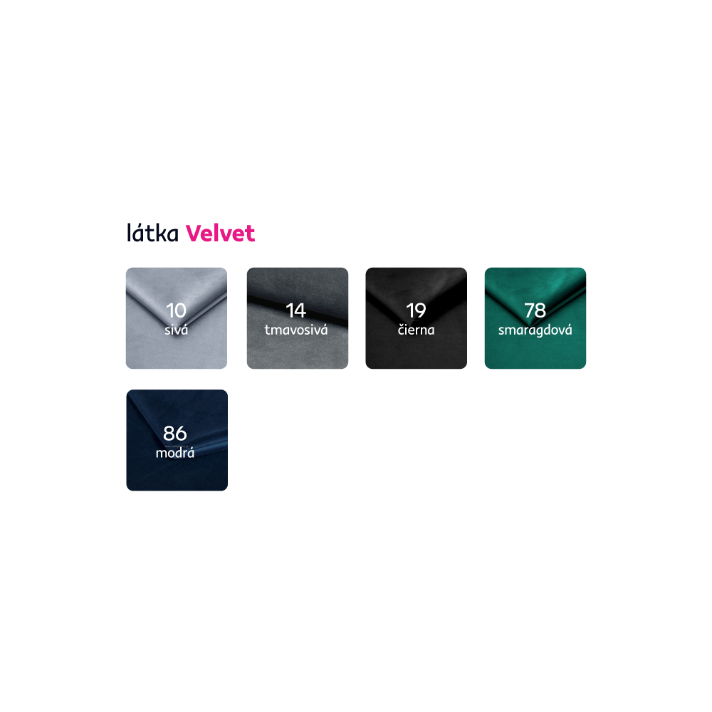 Možnosť objednania v 5 farebných odtieňoch látky Velvet s dodacou lehotou 8-10 týždňov. Pri individuálnej objednávke je potrebné zaplatiť 20% zálohu z danej sumy. Po uhradení zálohy bude Vaša požiadavka zadaná do výroby.
