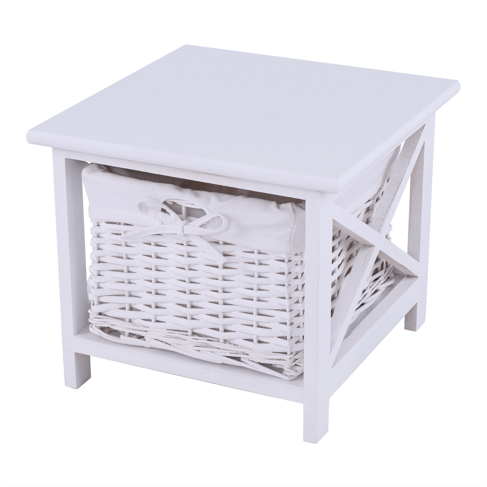 Nočný stolík RAFAELLO Materiál: prútie/drevo/látka Farba: biela Rozmery (ŠxHxV): 36x37x30 cm Dodávané v monte.